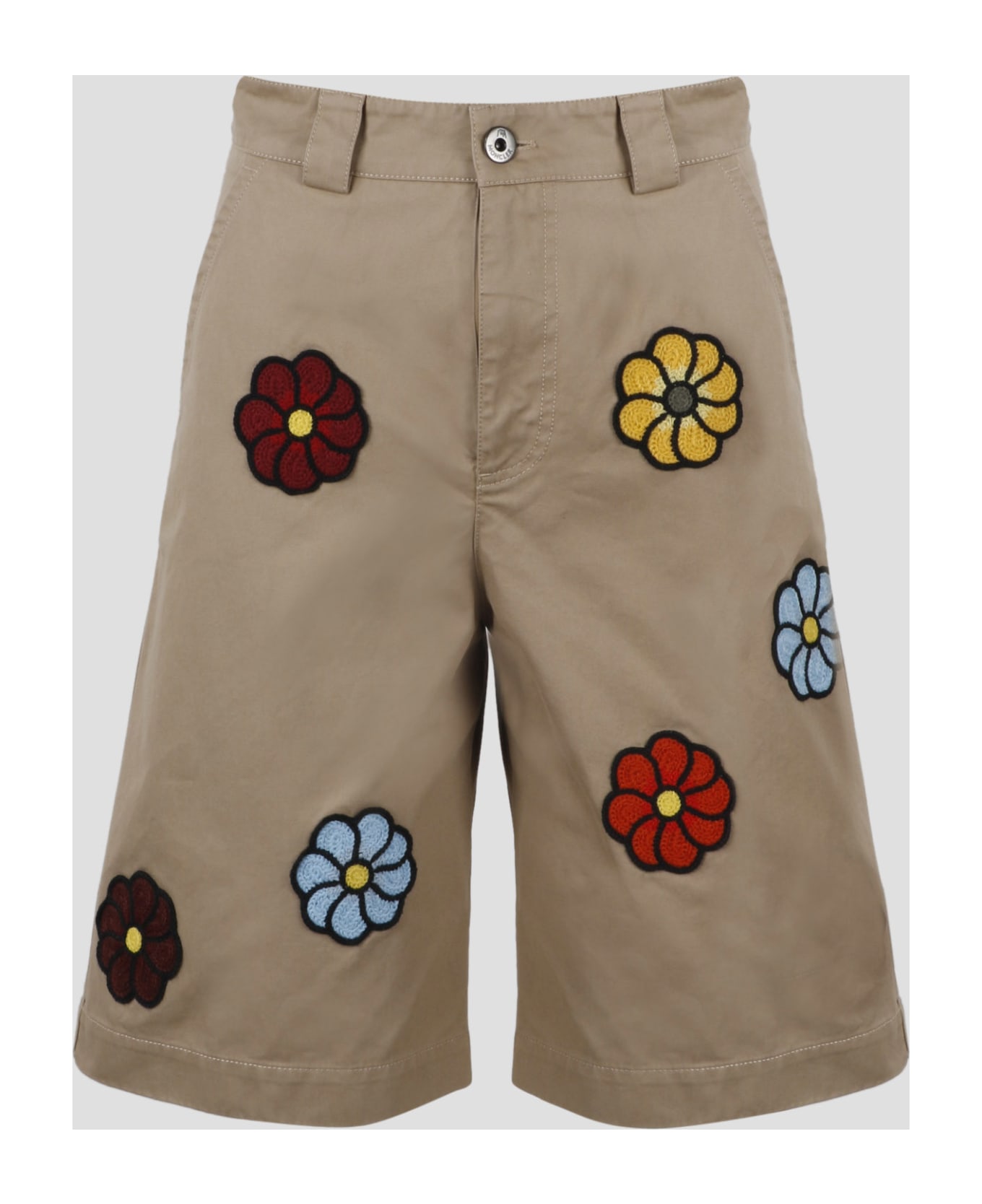 Moncler Genius bermuda shorts , in cotton gabardine with crochet patch flower. - SS23 - Moncler 1 JW Anderson collection - Oversized fit - Belt loops at the waist - Zip and button closure - Side pockets - Back welt pockets with button - Leather logo label on the back - Made in Italy - 100% Cotton