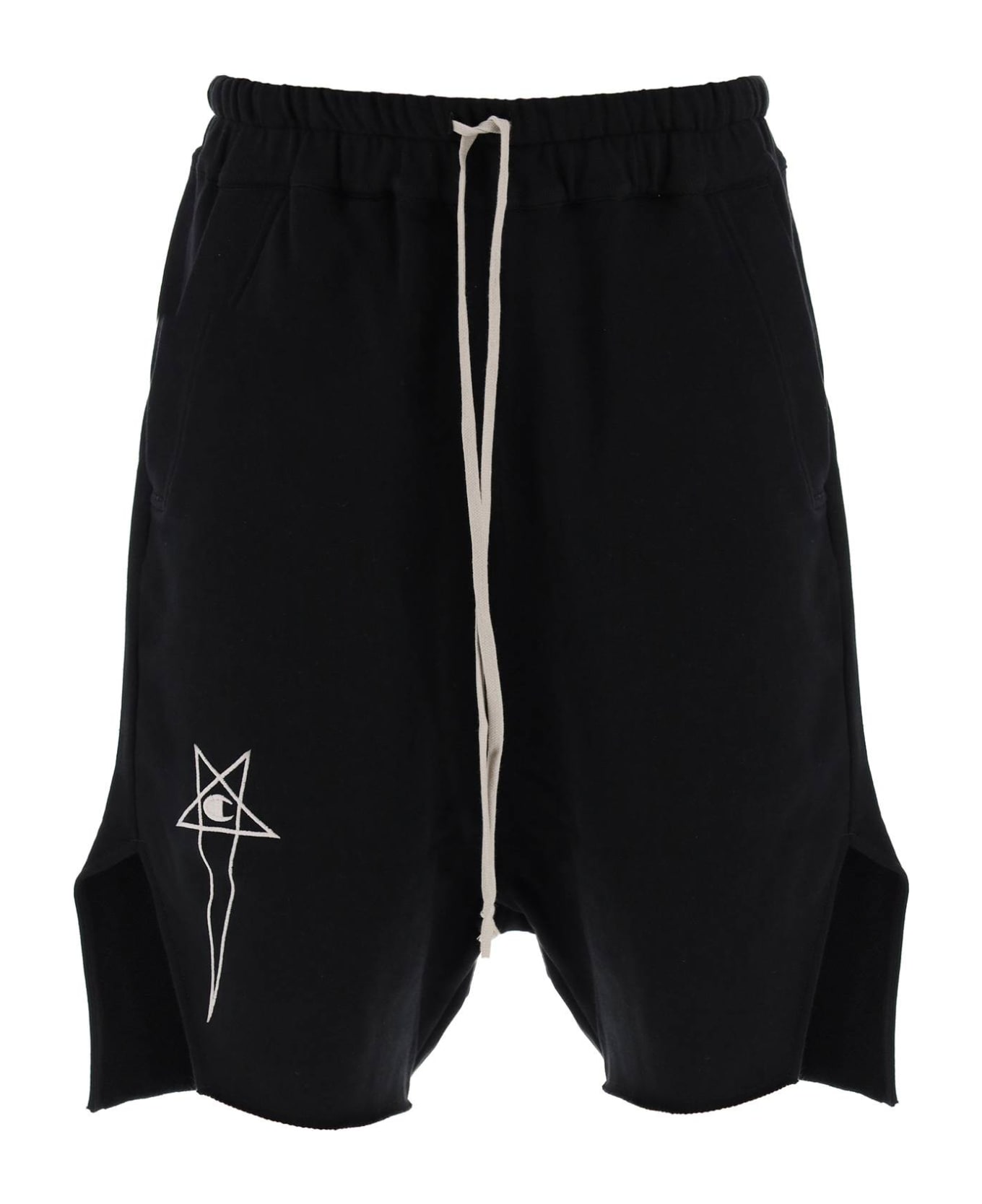 Drawstring shorts made of loop-back organic cotton fleece from the Rick Owens x Champion capsule, embellished with collaboration Pentagram logo embroidered on the right thigh. Finished with a raw-cut hem, this style features dropped-back side vents, an elasticated waistband, side slash pockets and back flap pockets. The model is 187 cm tall and wears a size L.