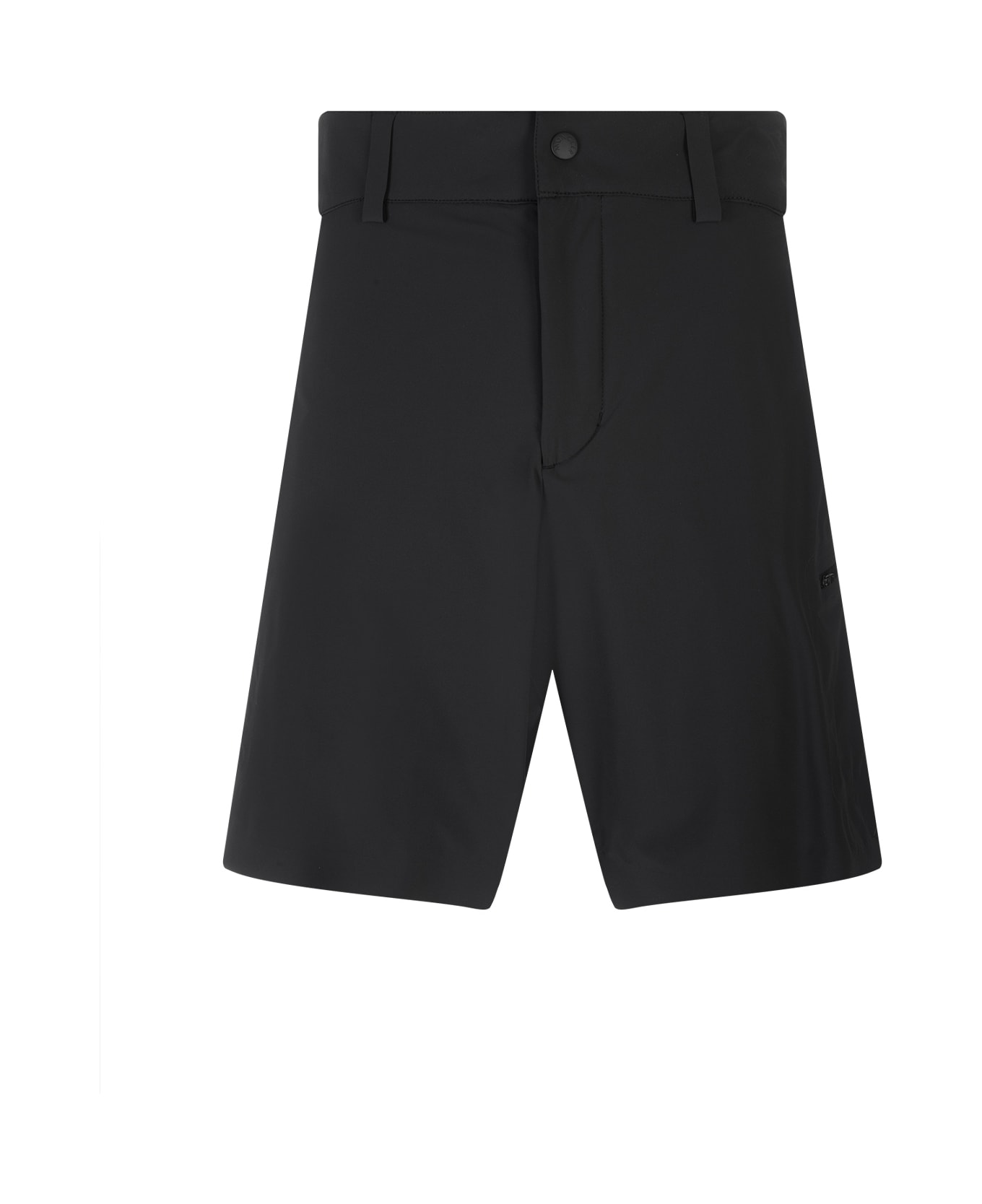 Moncler Grenoble bermuda shorts made of black water-repellent nylon and featuring a mid-rise waist, belt loops, zippered and buttoned flap, zippered side pockets and a contrasting color logo print.