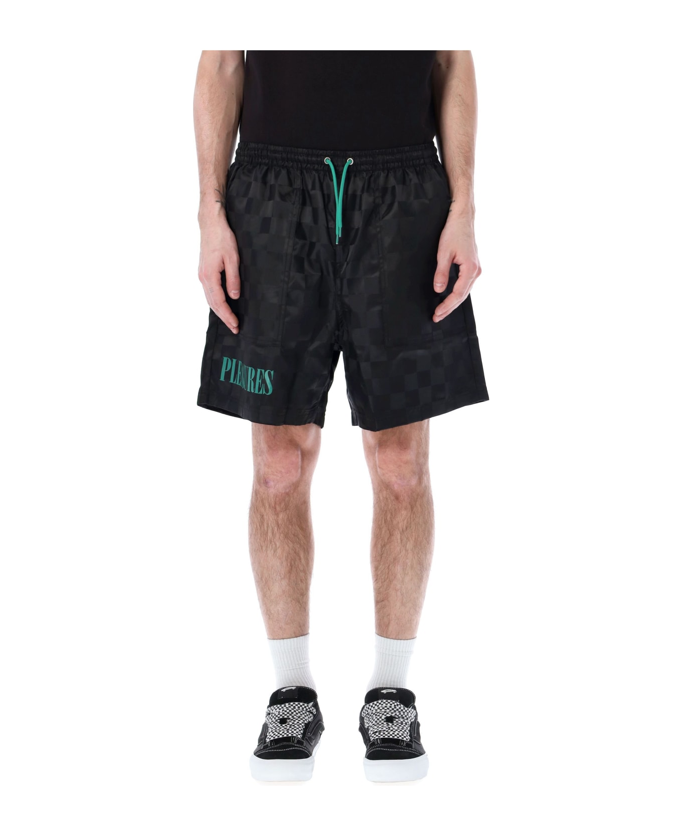 Nylon Bpm Shorts By Pleasures. Featuring: Elastic Waistband With Contrast Drawcord Side Pockets Rear Welt Pocket Checkered Pattern Logo Print At Front The Model Is 1,90 M Tall And He's Wearing Size L