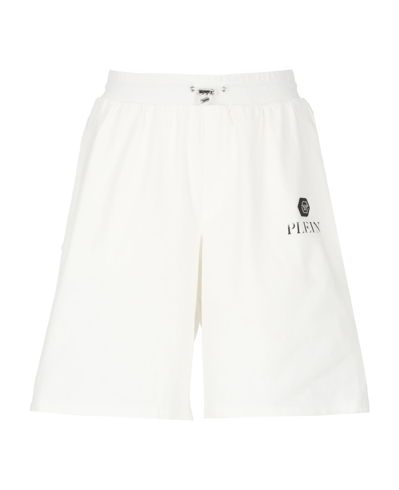 - White Philipp Plein cotton shorts for man - Elastic wais with coulisse - Two side slit pockets - One back pocket - Patch with metallic logo - Contrasting color logo