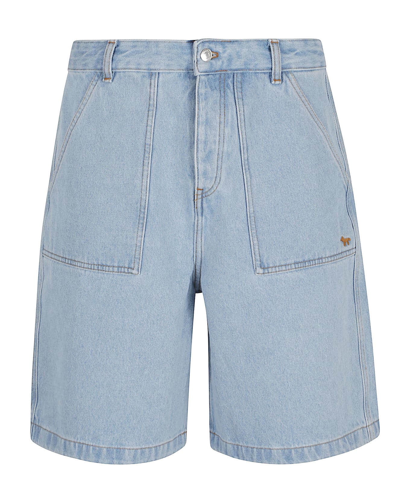 Denim shorts by MAISON KITSUNE. Concealed engraved metal button fastening; Belt loops on the waist; Two front patch pockets; Relaxed fit design. Features contrast piping fox embroidered on the front pocket and contrasting Maison Kitsuné Handwriting signature embroidered on the back pocket.