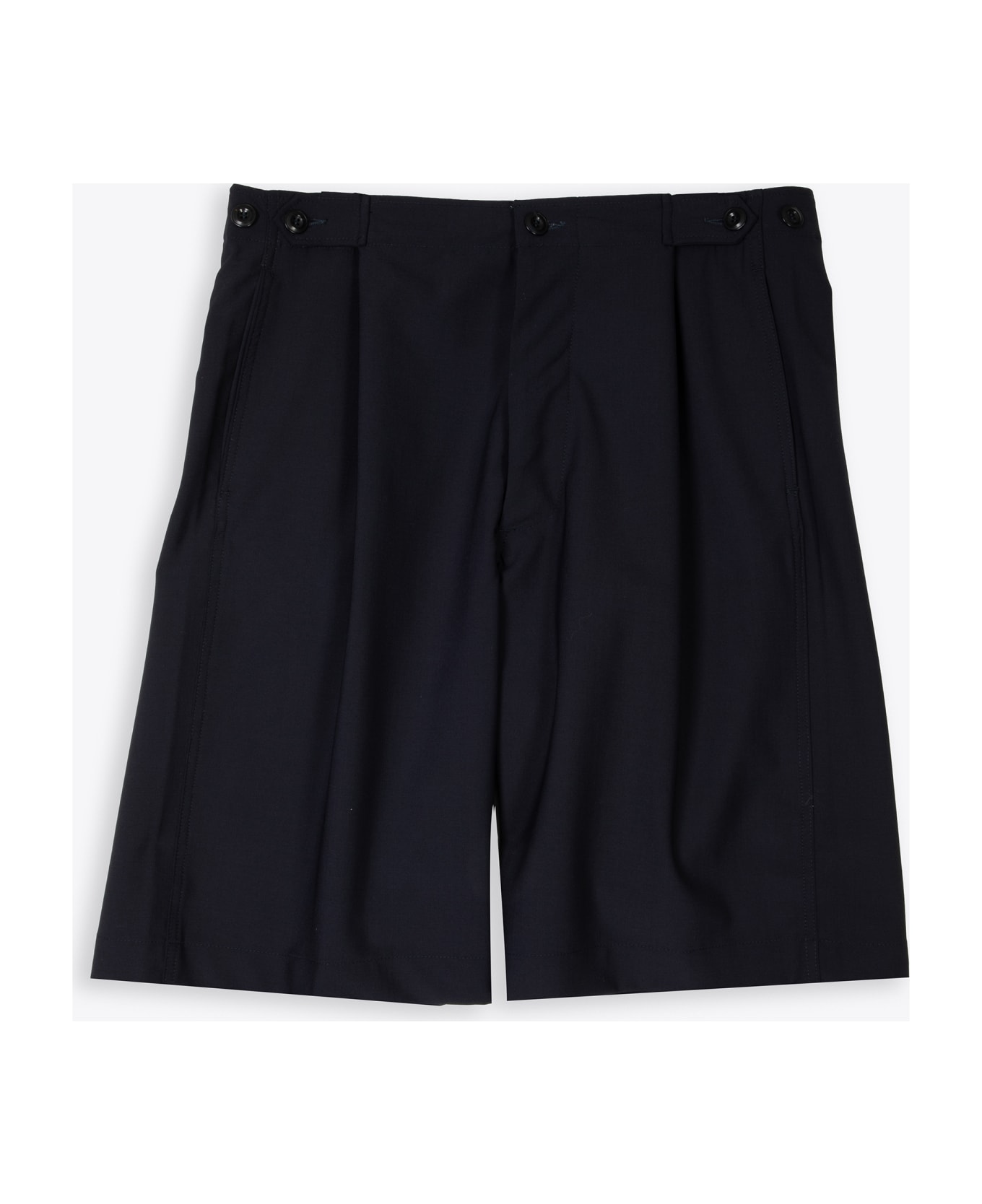 Navy blue short with button-adjustable waistband to fit several sizes. Two side pockets. Single back pocket with button. Relaxed fit. Composition: 53% polyester 43% wool 4% elastane. Made in Italy.