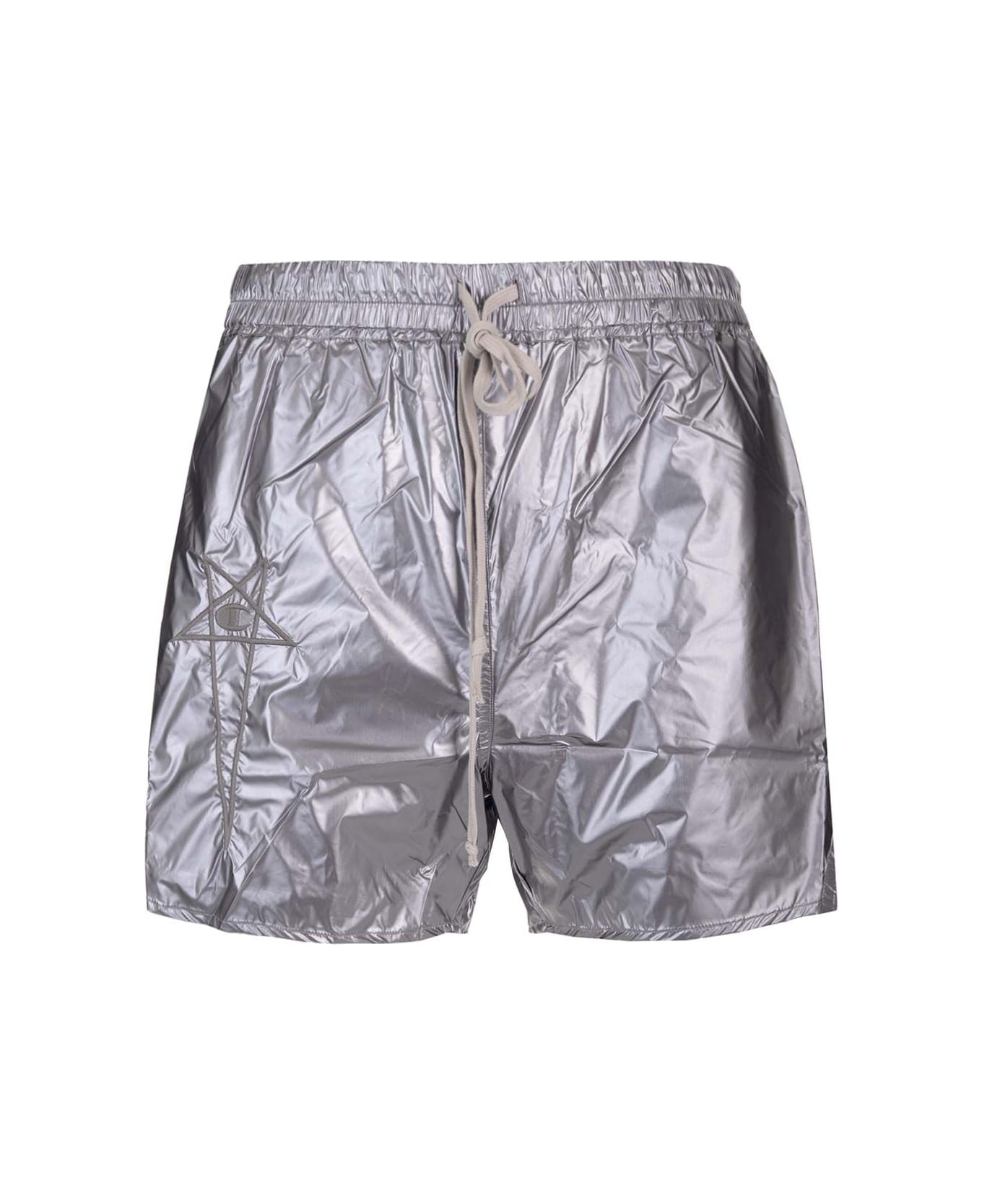 Gunmetal metallic recycled nylon "Dolphin" boxer shorts from Rick Owens x Champion, with elasticated waist, 3D Rick Owens x Champion logo embroidered on the right thigh and a Champion logo on the left rear hip.