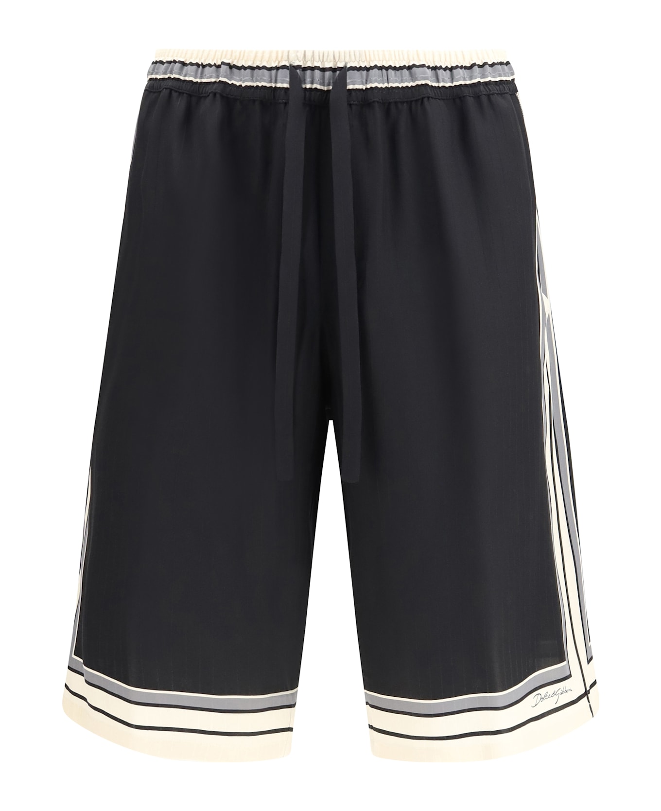The drawstring shorts by dolce & gabbana deliver a refined casual aesthetic. the striped trim adds a distinctive graphic touch, while the drawstring fastening ensures comfort and an adjustable fit. a rear button-fastening pocket completes the design with a functional, tailored detail, making them perfect for effortless yet sophisticated summer styling.