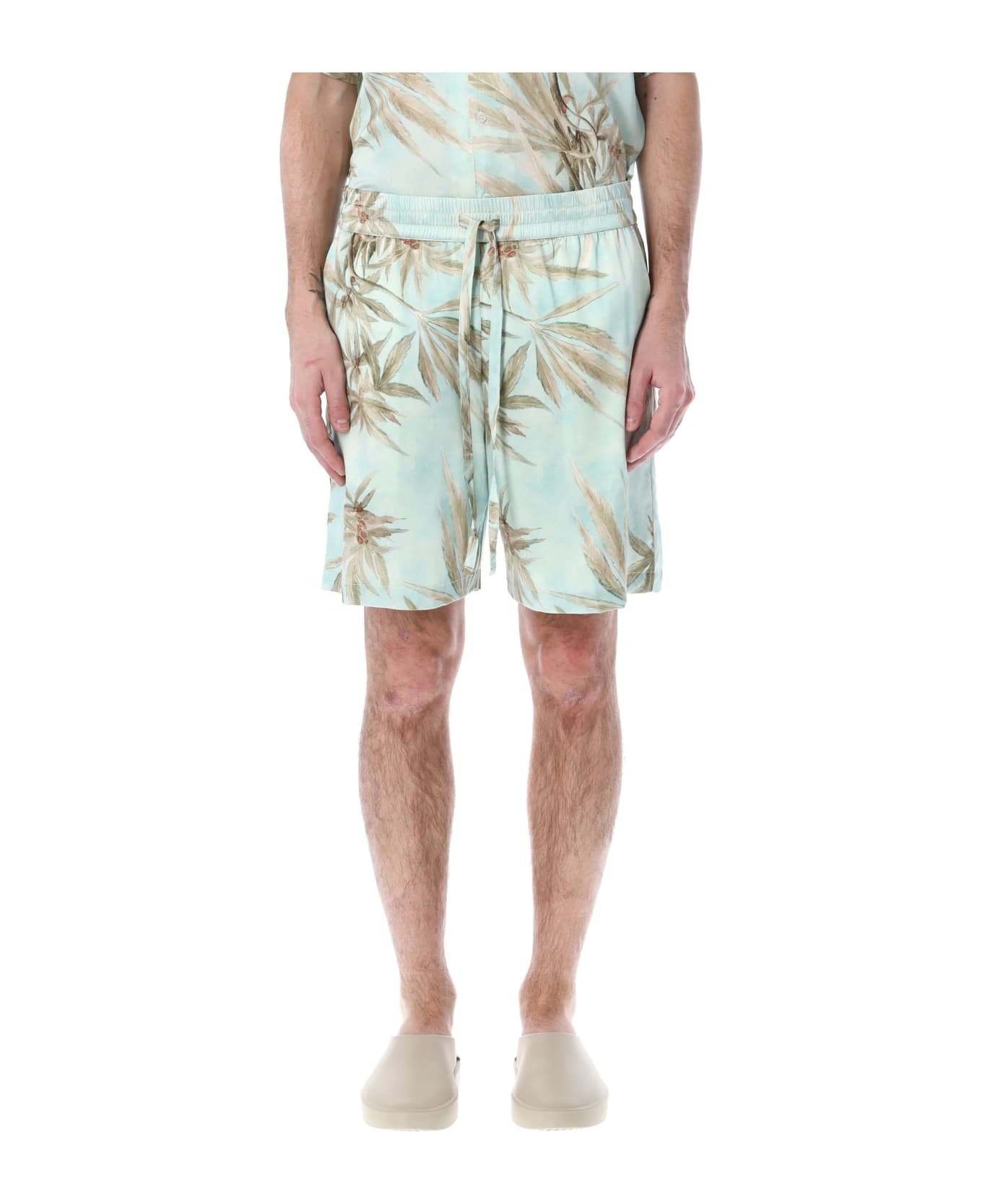 Hemp Leaves Silk Shorts By Nahmias. Featuring: Elasticated Waistband With Drawstring Slit Pockets Printed Above-knee Length Model Is 1,90 M Tall And He Is Wearing Size L