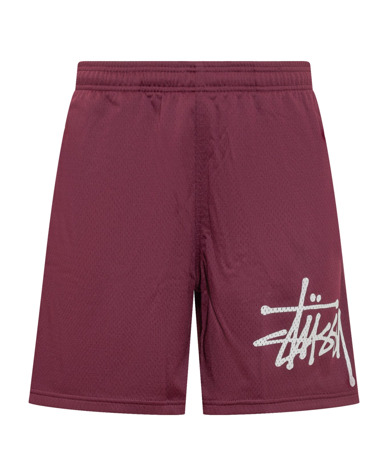 Purple shorts. Elastic and drawstring waist. Logo printed on the bottom. Side and back pockets.