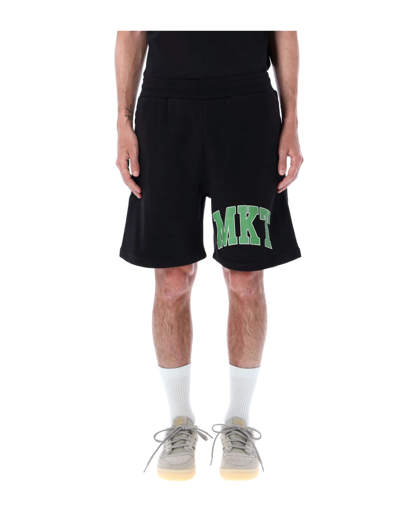 Cotton Mkt Arc Sweatshorts By Market. Featuring: Elasticated Drawstring Waistband Slit Pockets Mkt Printed On Left Leg Rear Patch Pocket Model Is 1,90 M Tall And He Is Wearing Size L
