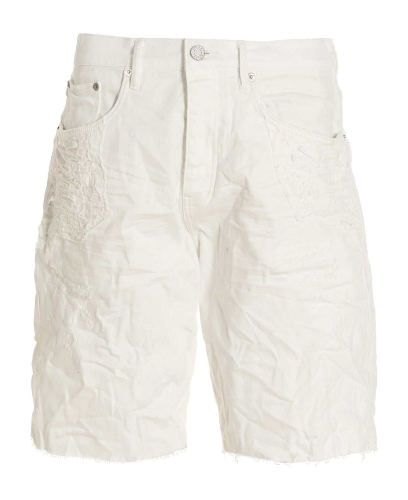 P021' bermuda shorts in braided effect cotton denim with used-effect details, button closure, five pockets, frayed hem and a leather logo tag.