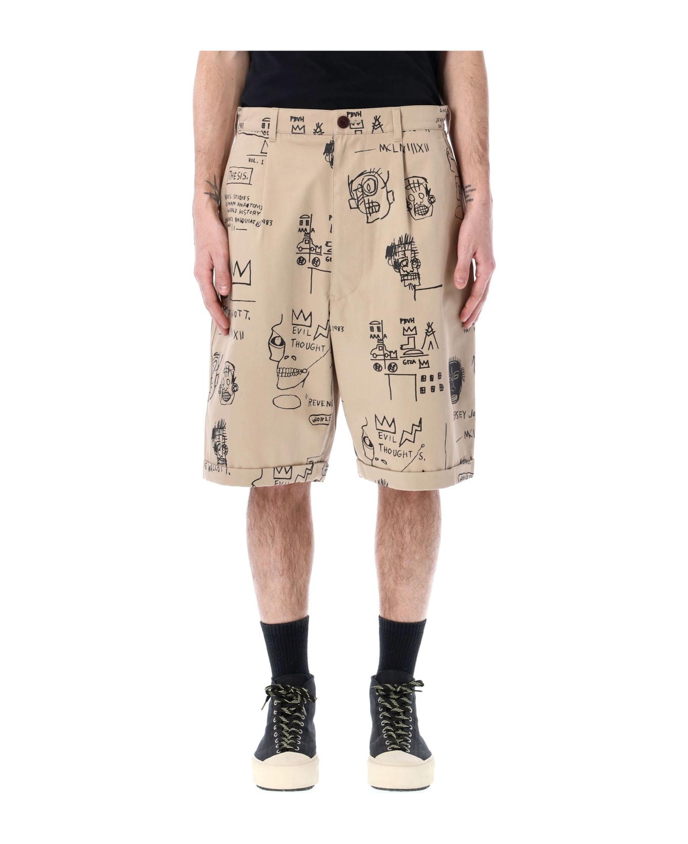 Cotton Printed Bermuda Shorts By Junya Watanabe. Featuring: Button And Zip Fastening Belt Loops One Pleat Slit Pockets All-over Graphic Prints Turned Hems Rear Welt Pockets Model Is 1,90 M Tall And He Is Wearing Size Xl