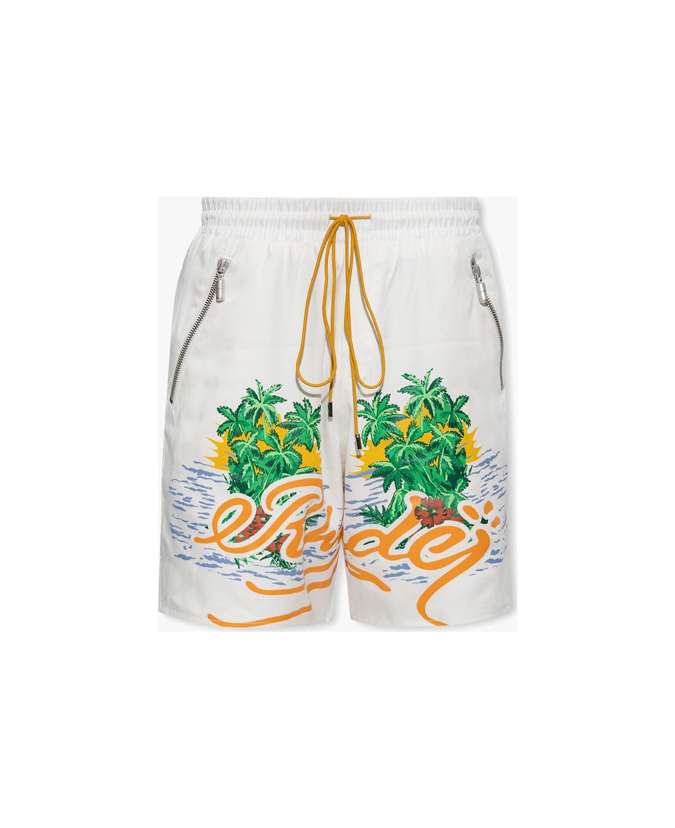 White shorts from Rhude. Cinched with drawstrings at the waist, this pair features a colourful graphic print, logo detailing, two front zip pockets and two back flapped pockets.