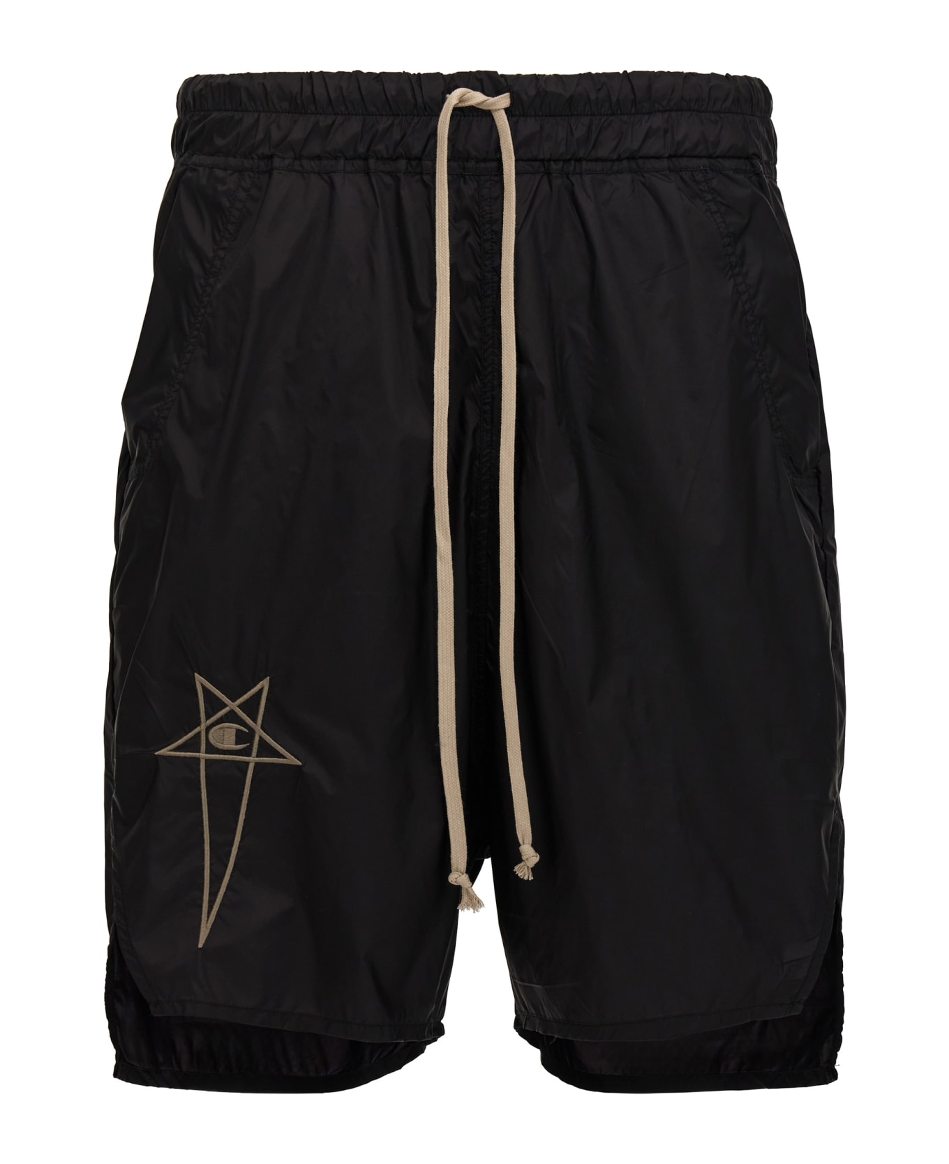 Rick Owens x Champion nylon 'Beveled Pods' bermuda shorts with logo embroidery, drawstring elastic waistband, pockets, side splits.