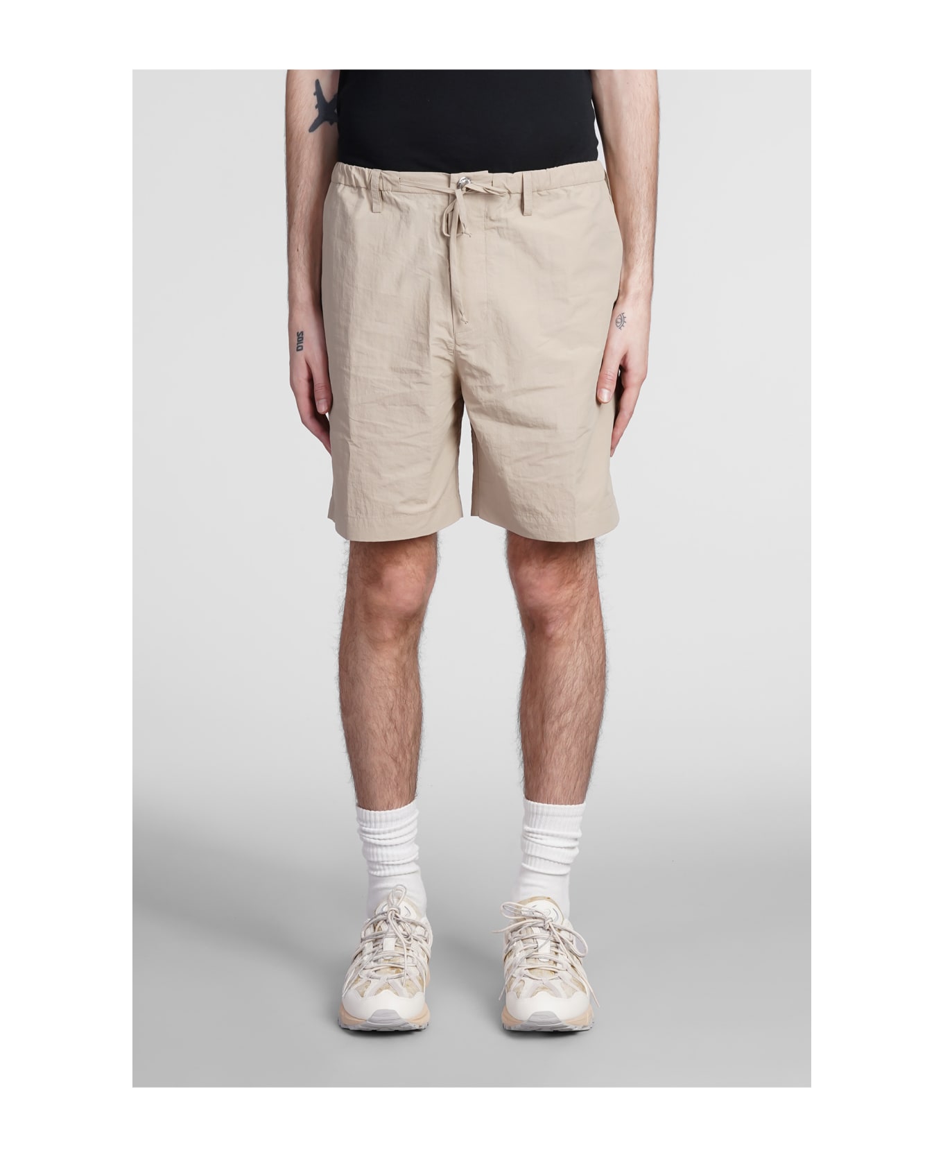 Shorts in beige nylon, elastic waist, buttons closure, coulisse closure, pockets, 72% polyamide 28% cotton, Made in Hungary, Model is 1. 83 and wears size M