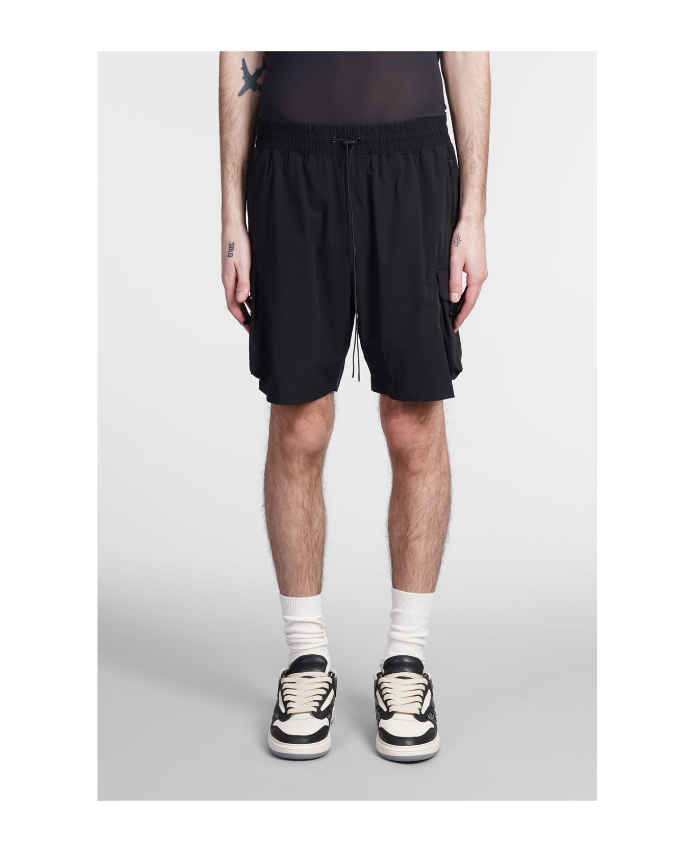 Shorts in black nylon, elastic waist, coulisse closure, cargo pockets, pockets, 87% nylon 13% spandex, Model is 1. 83 and wears size M, Made in China