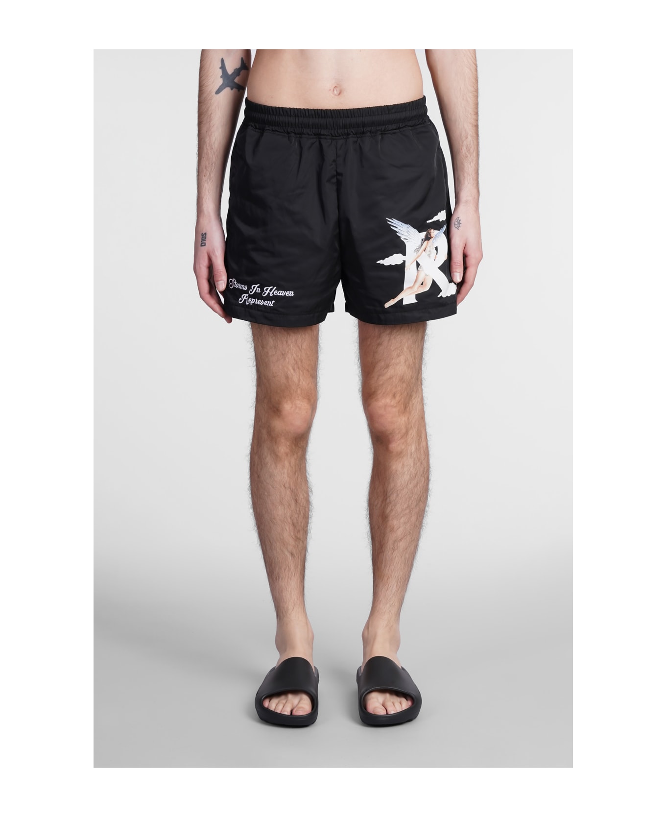 Beachwear in black polyester, elastic waist, side embroidery, four pockets, 100% polyester, Made in Portugal, Model is 1. 83 and wears size M