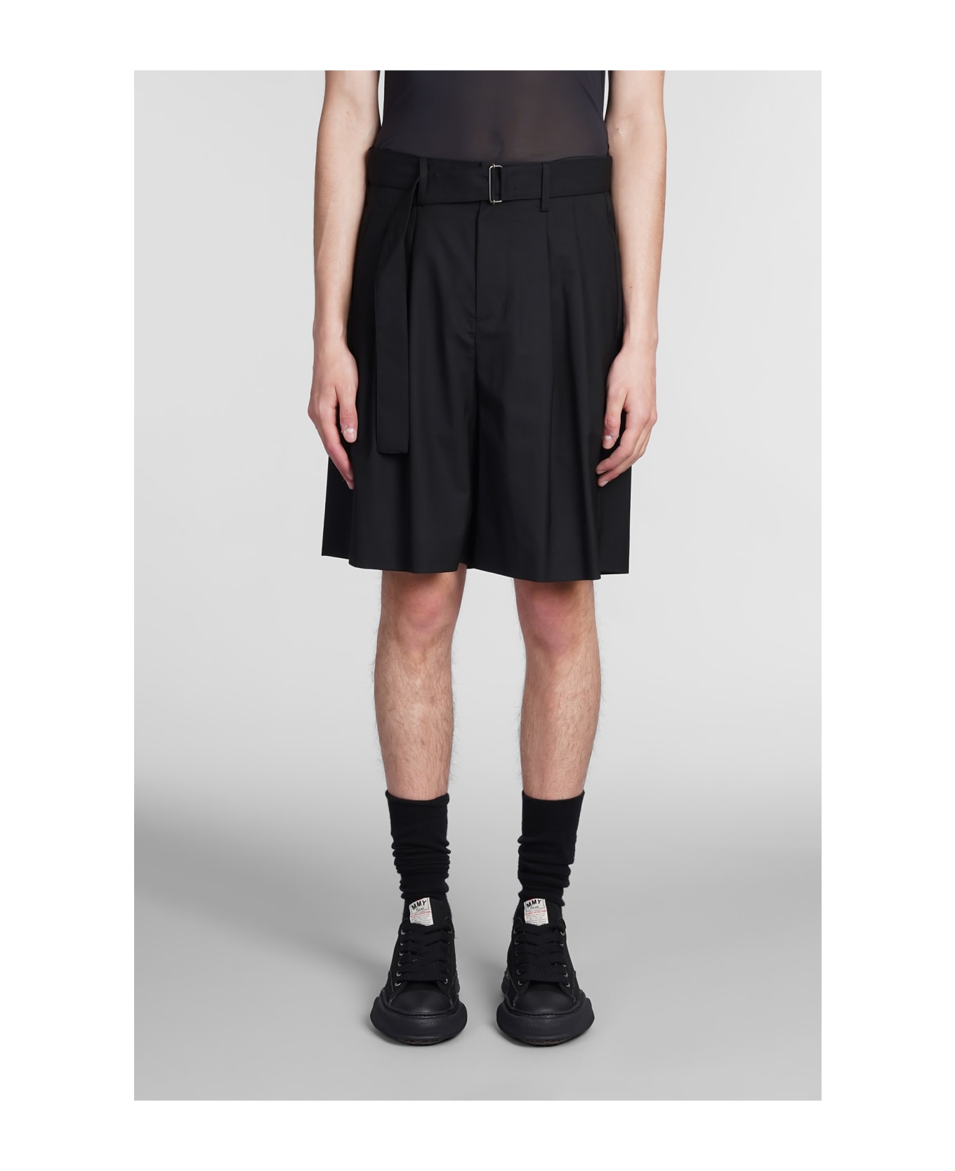 Shorts in black wool, belt waist, pence, four pockets, 75% wool, 25% triacetate, Made in China, Model is 1. 83 and wears size 2