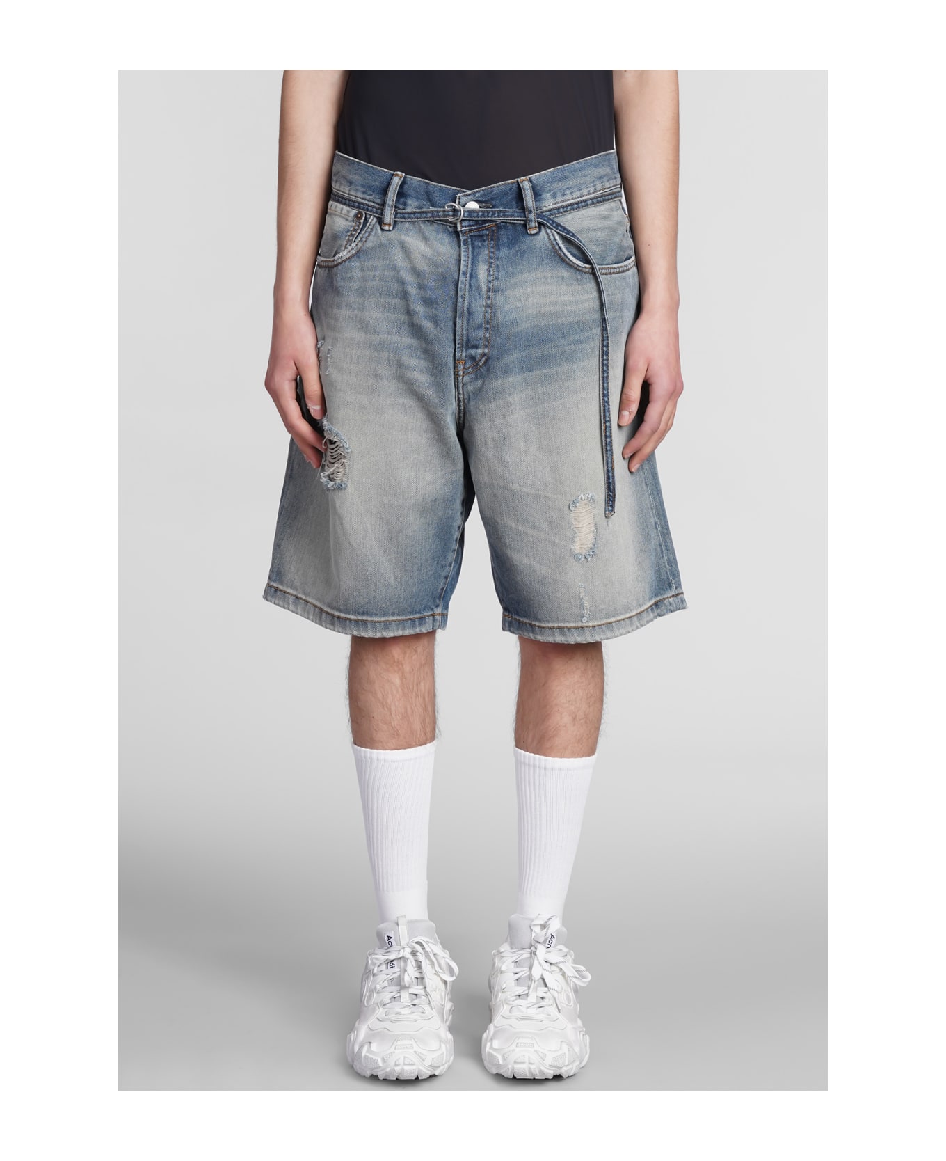 Shorts in blue cotton, button and zip closure, five pockets, waist belt loops, belt waist, 100% cotton, Made in Italy, Model is 1. 83 and wears size 31