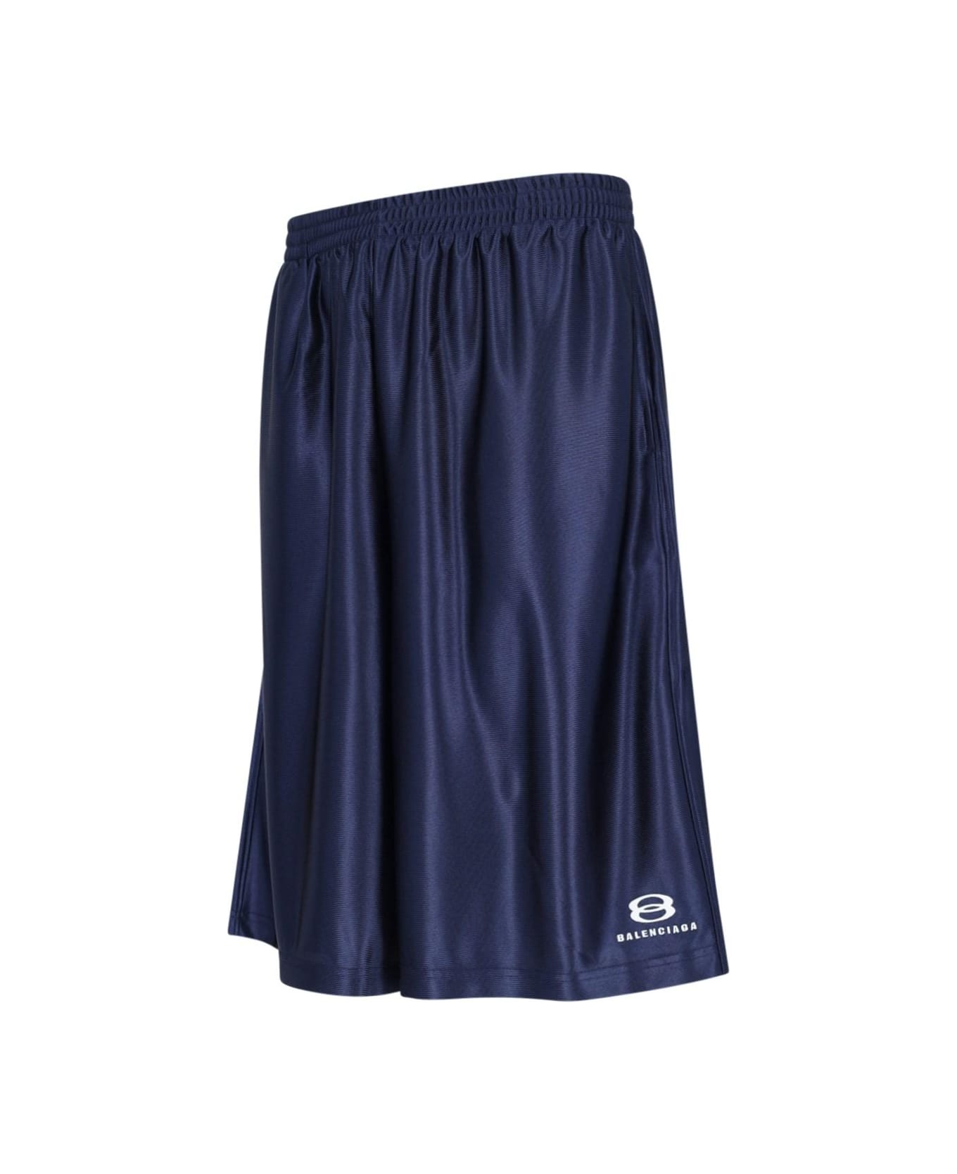 Balenciaga 'Unity Sports Icon' sports shorts in dark blue laminated jersey with mid waist, drawstring, white logo embroidery on the front, two side welt pockets, straight leg, below knee length detail.