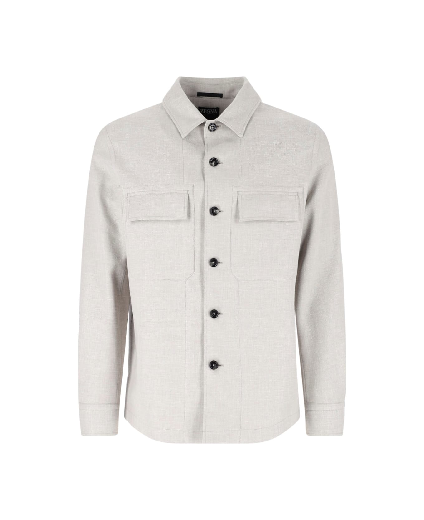 Zegna 'Alba' shirt jacket in silk linen and grey mélange wool with classic collar, button closure, two chest flap pockets, back tab, button cuffs, curved hem. Composition: 46% Linen, 31% Wool, 19% Silk Mulburry, 3% Polyamide, 1% Lycra