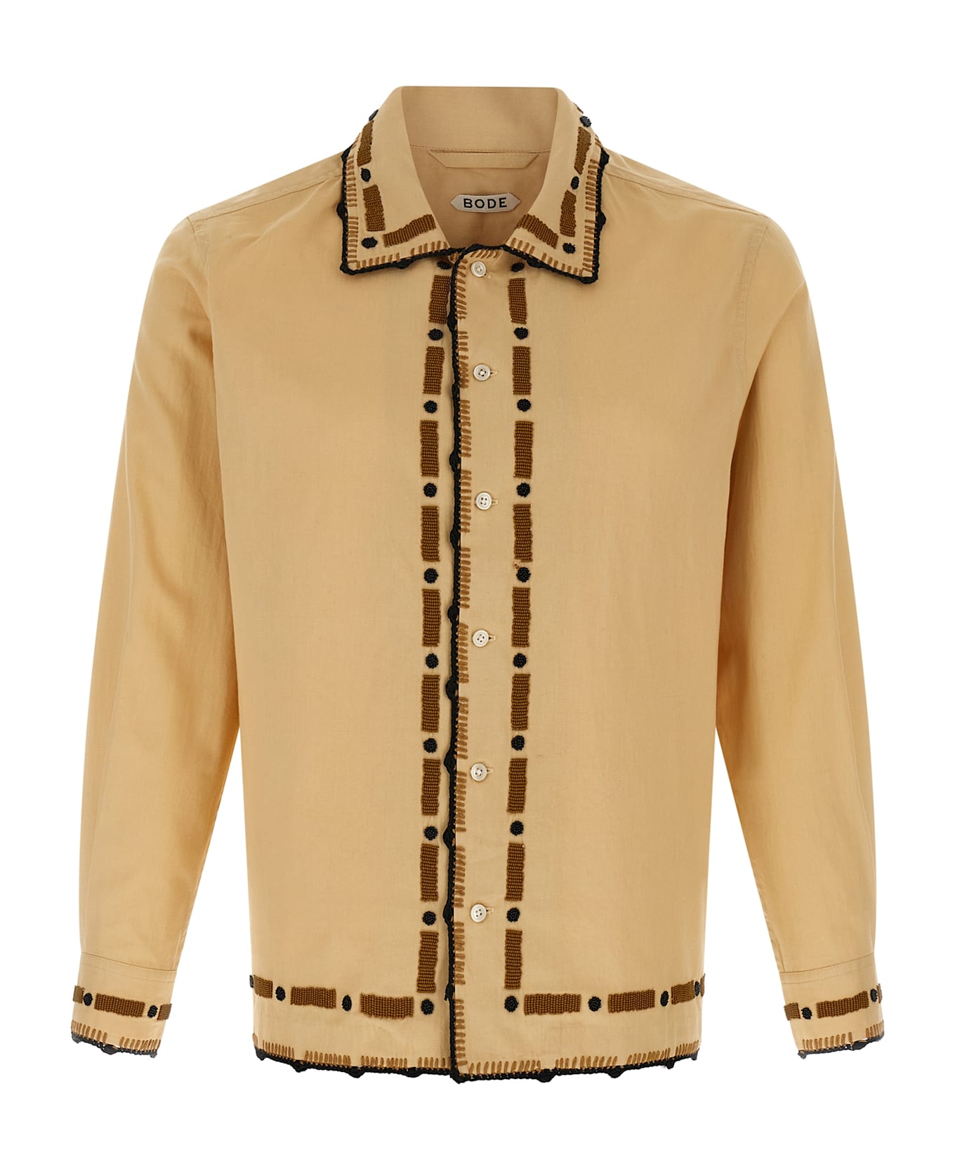 'Beaded Ryegrass' cotton shirt with embroideries and handmade beads, front button closure, long cuffed sleeves.