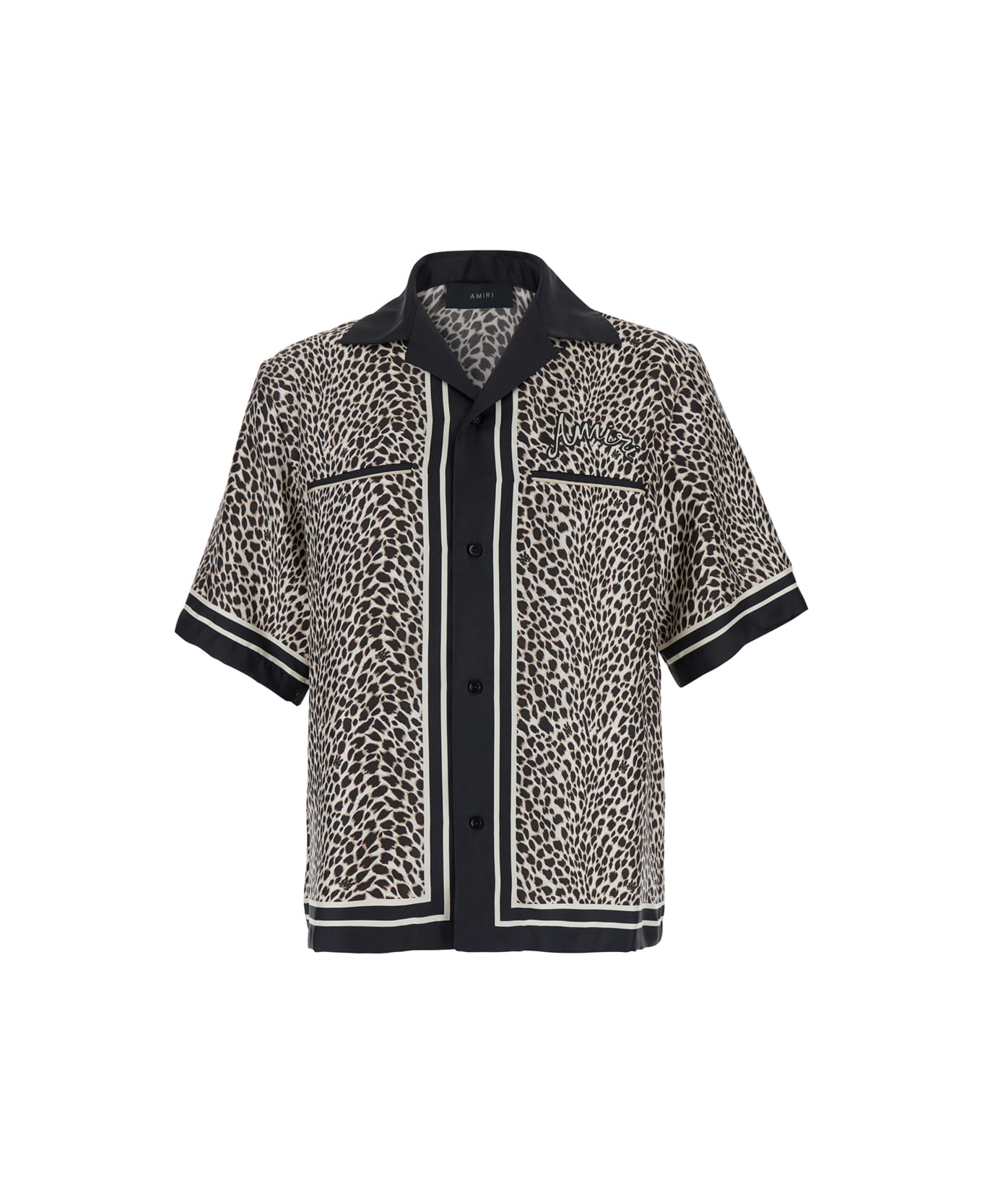 Bowling shirt Black Cuban collar Short sleeves Front button clousure All-over Leopard print Silk Relaxed fit