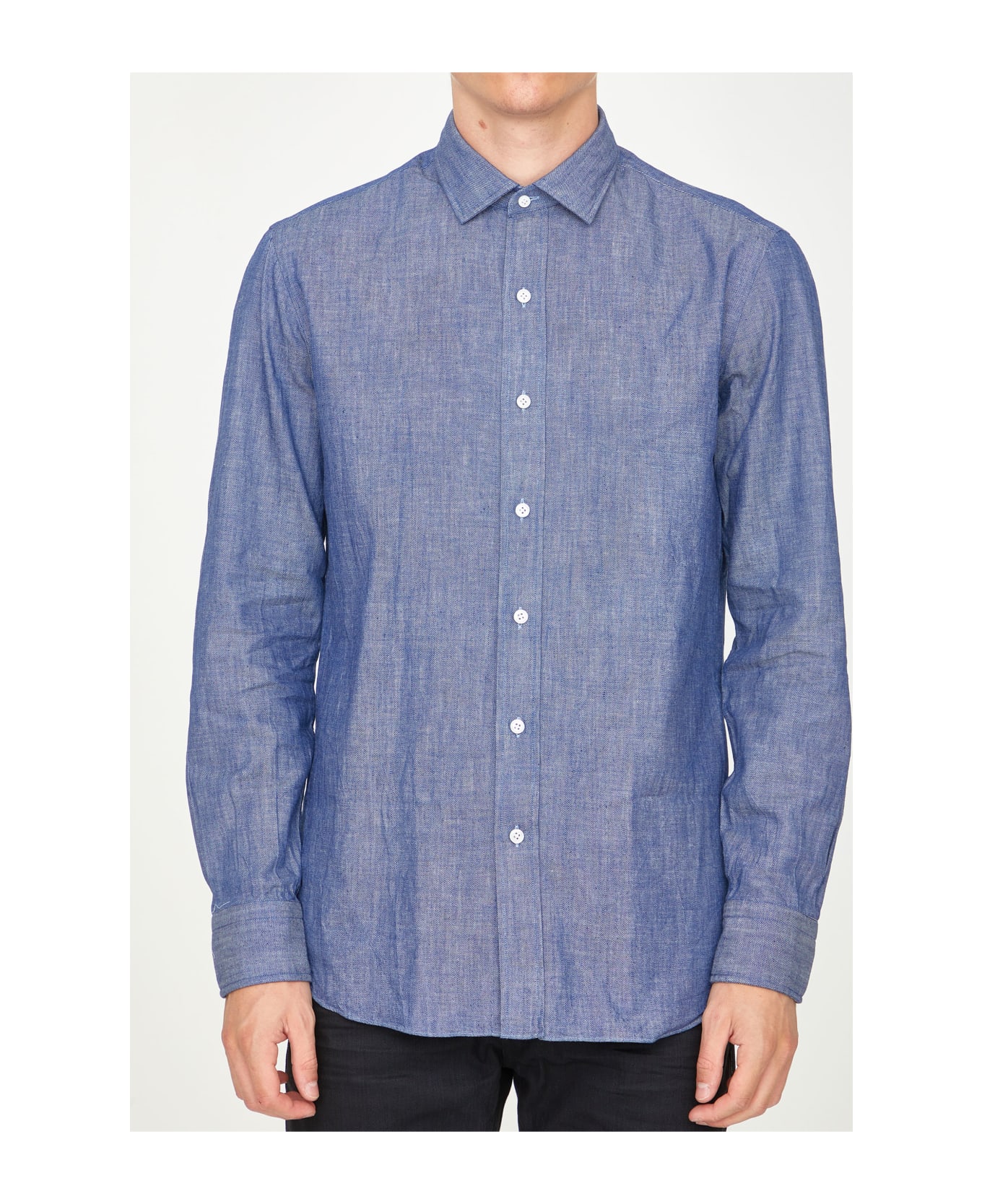 Long-sleeved shirt in blue Japanese cotton denim. It features classic collar, front button closure and buttoned cuffs.
