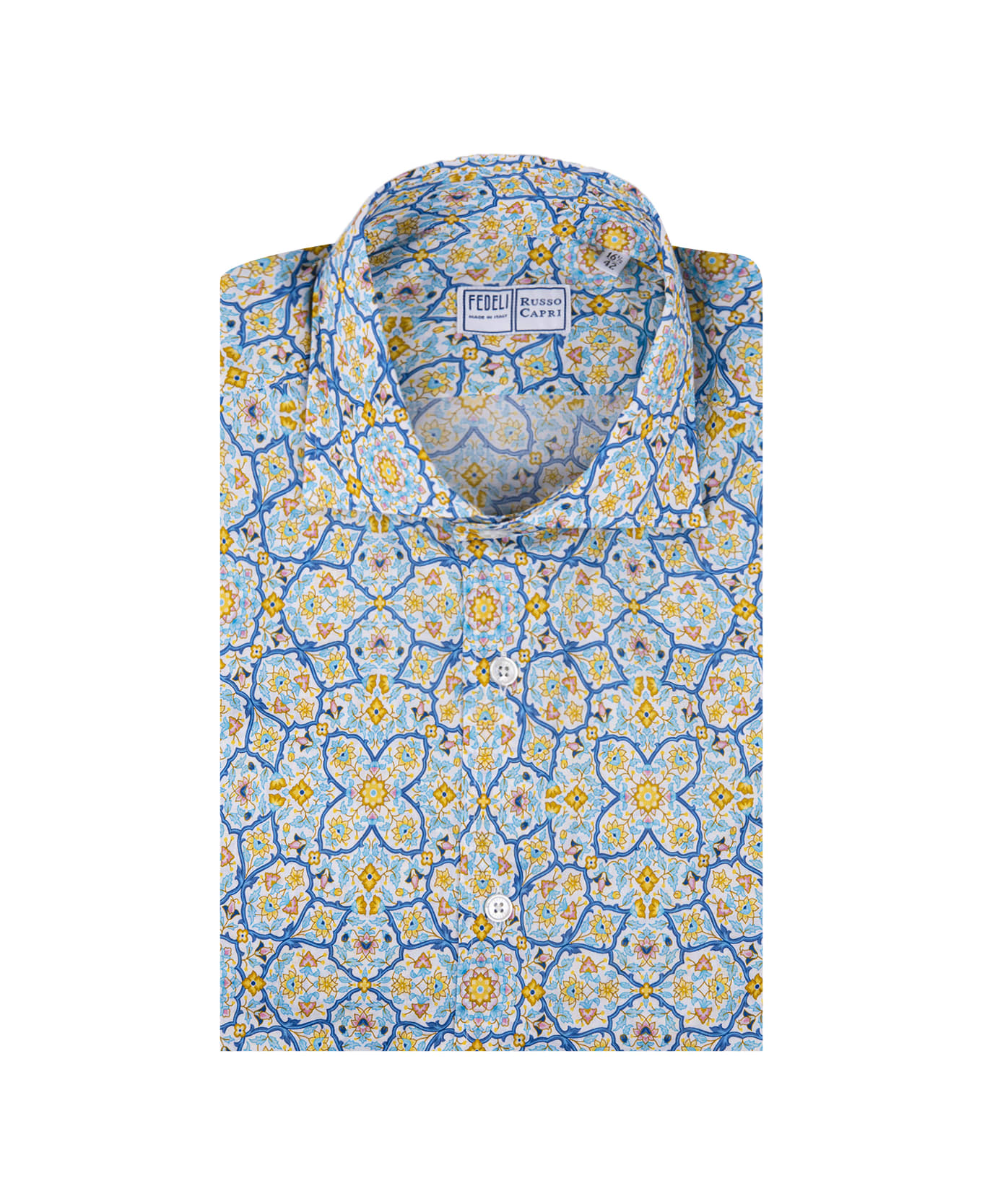 Classic shirt by Fedeli in collaboration with Russo Capri made of white cotton with all-over blue, pink and yellow printed majolica pattern. Model featuring a French collar, long sleeves and front button fastening. Regular fit. Composition: 100% Cotone