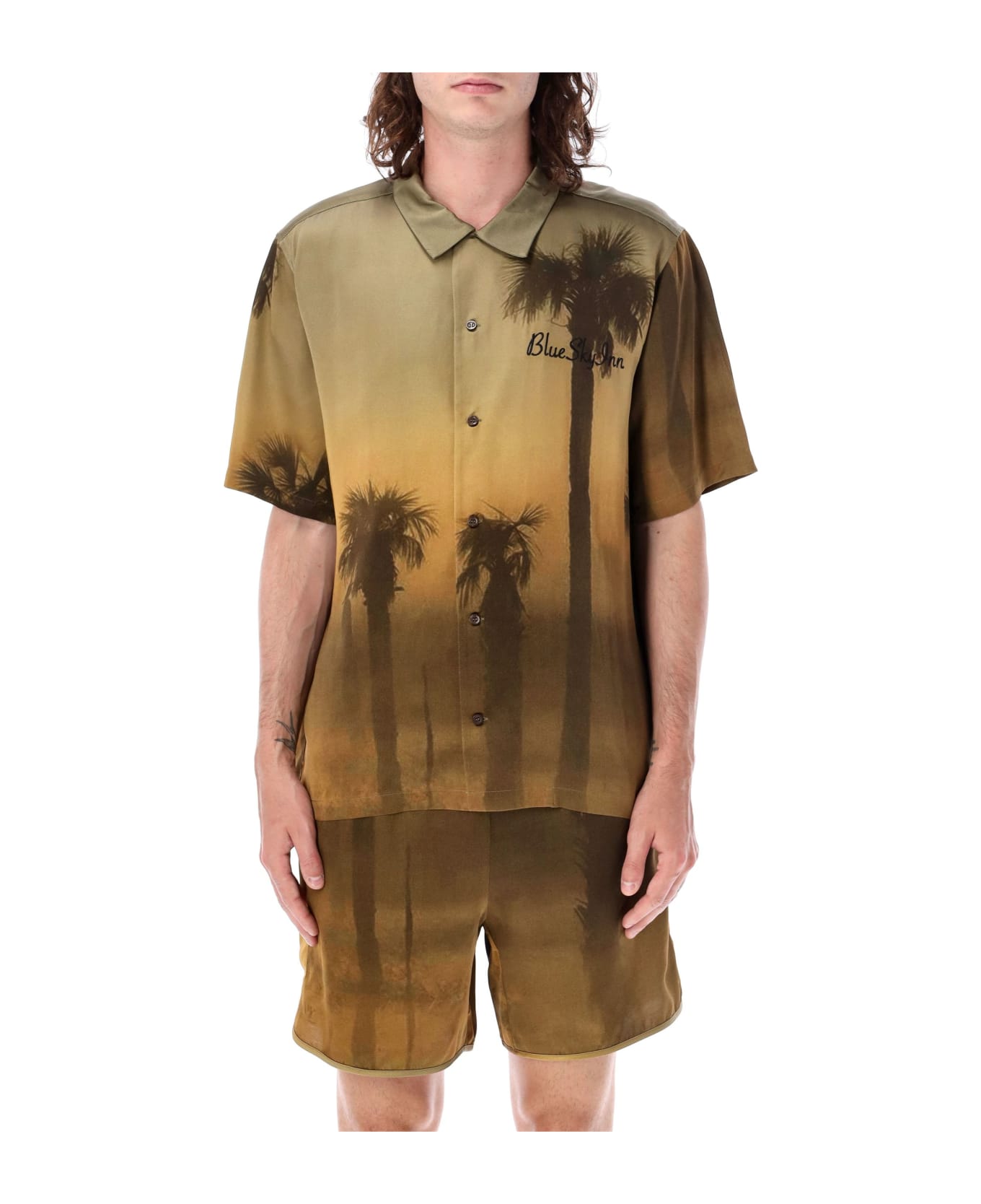 Bowling Shirt Palms By Blue Sky Inn. Featuring: Point Collar Button Closure Short Sleeves Embroidered "blue Sky Inn" Lettering At Chest Palms Design At Front And Back Straight Hem Model Is 1,90 M Tall And He Is Wearing Size L