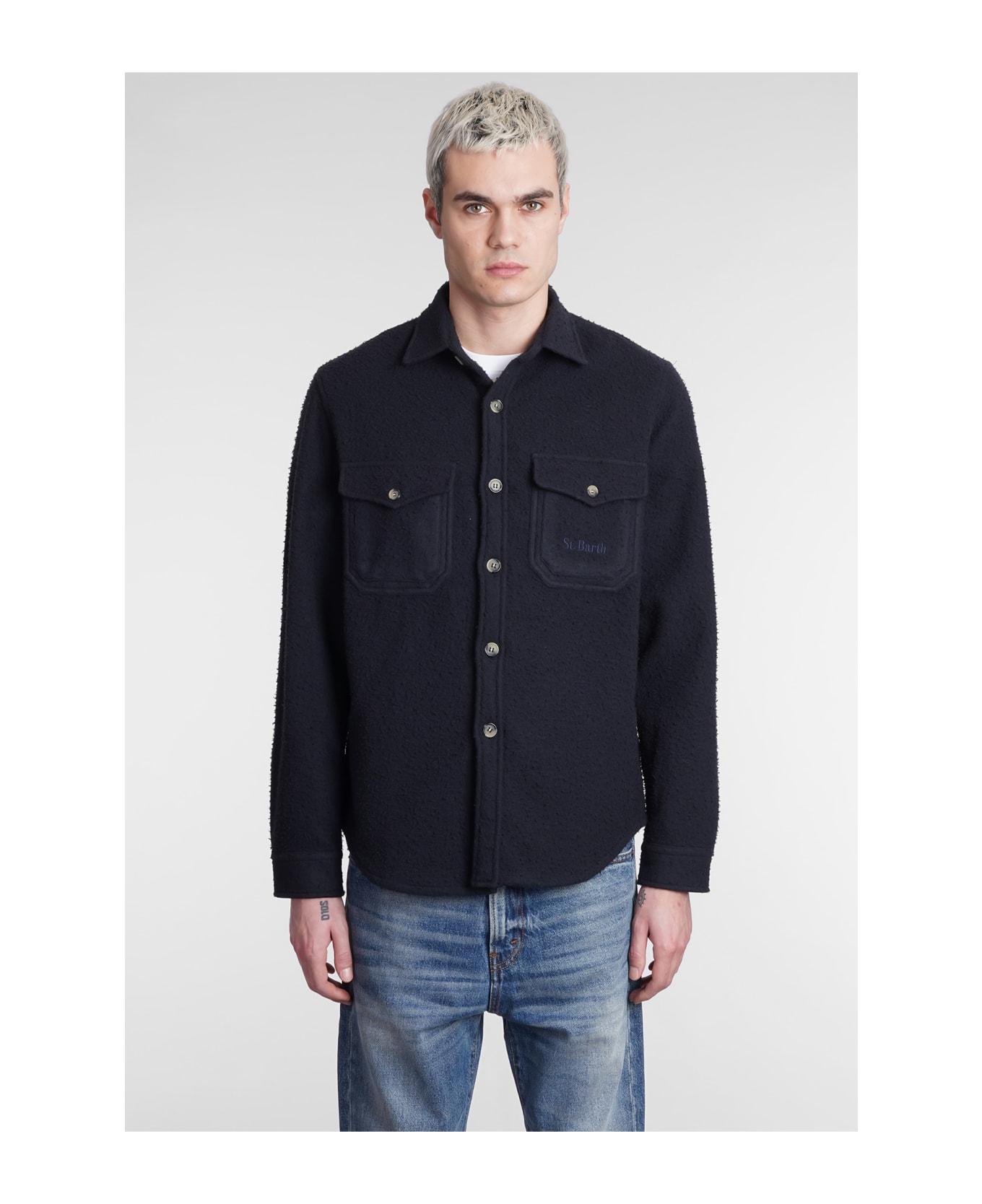 Burton Shirt in blue wool, collar, flap pockets, frontal buttoning, long sleeves, 80% wool, 20% polyamide, Model is 1. 83 and wears size S