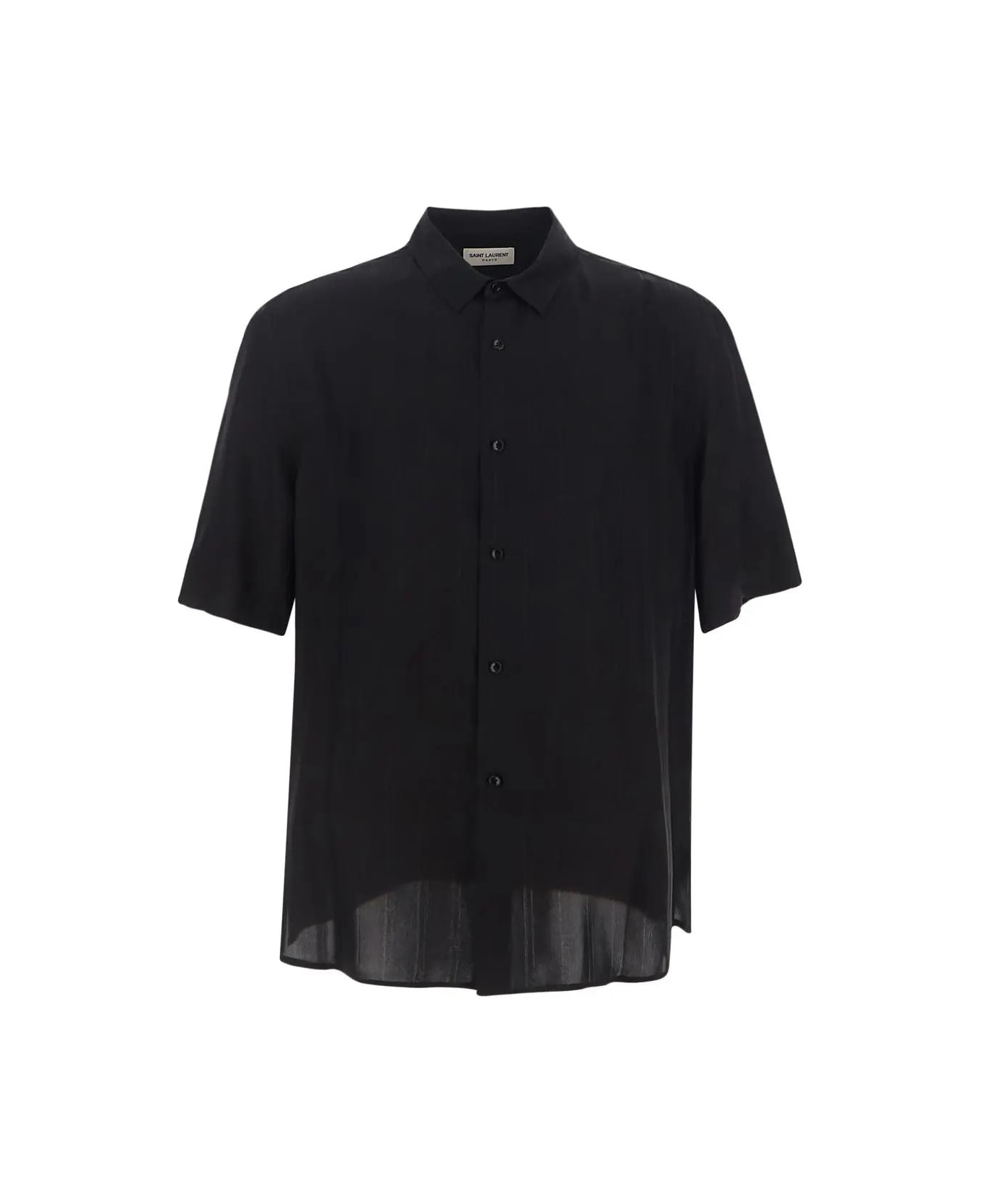 Saint Laurent shirt in black matte silk with all-over striped YSL logo motif, short sleeves, button closure, pointed collar and side splits. Composition: 100% Silk