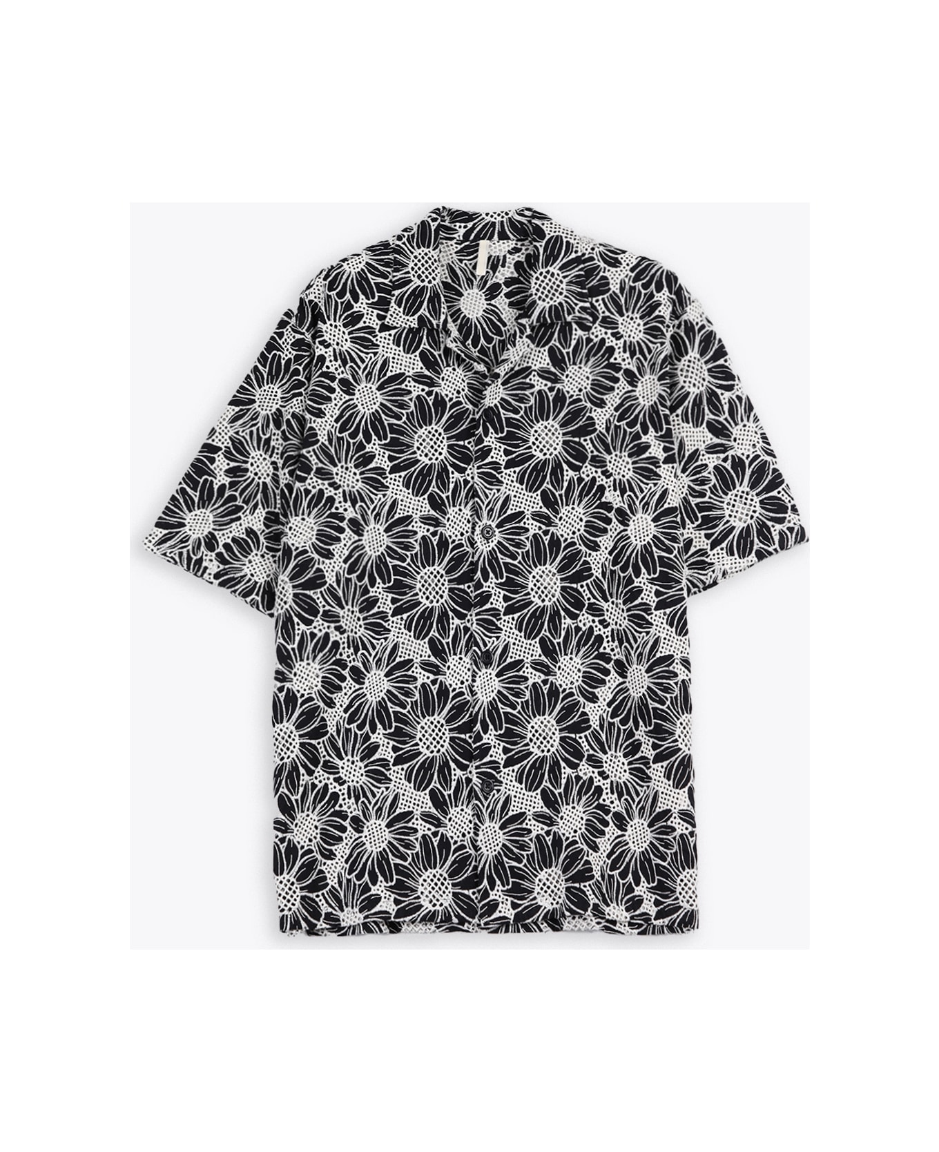 Black and off white cotton shirt with floral embroidery pattern. Camp collar. Short sleeves. Regular fit. Composition: 100% cotton. Made in Turkey.