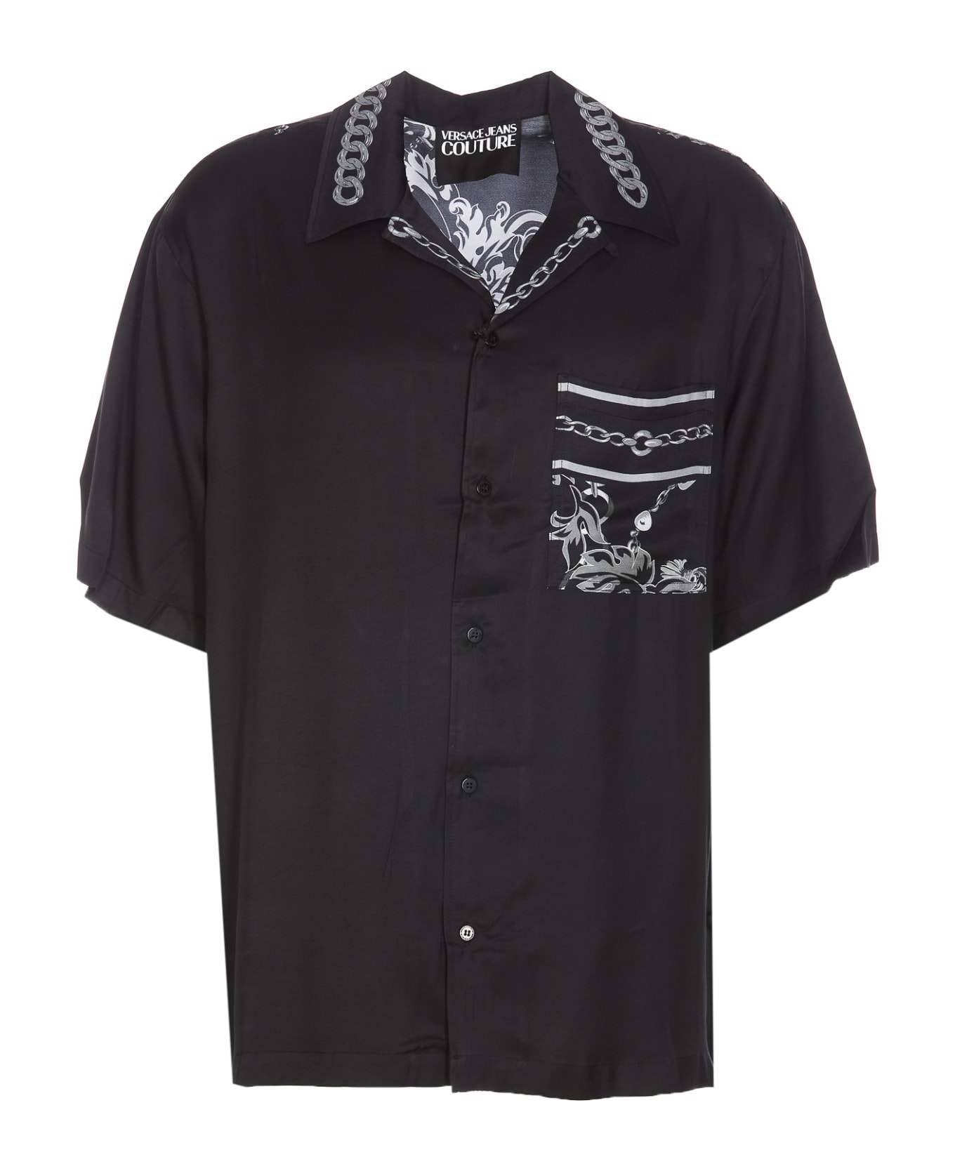 versace jeans couture black and silver shirt, frontal buttons closure, short sleeves, chain couture print