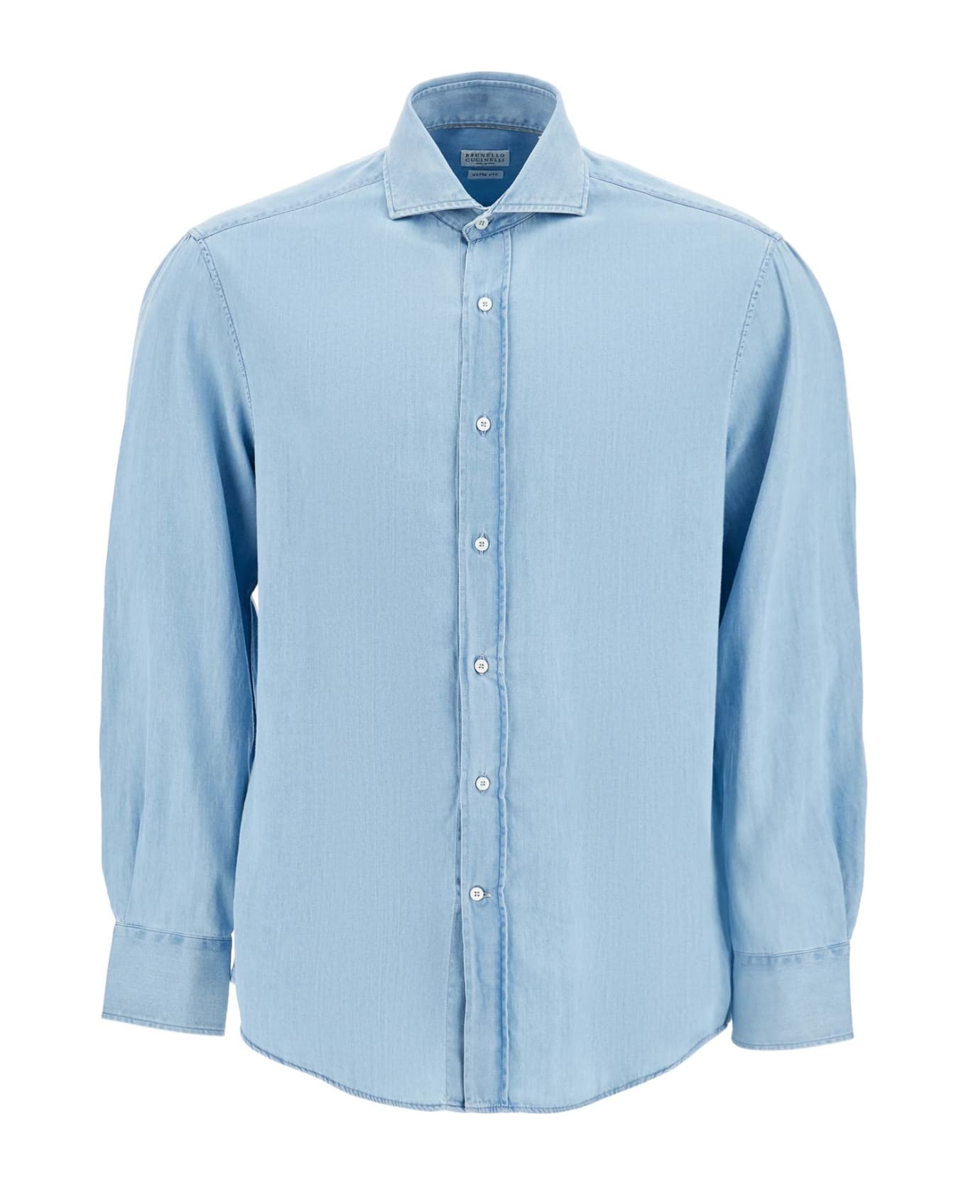 Brunello Cucinelli shirt crafted in pure cotton chambray with french collar. It features american button placket, buttoned cuffs, shaped hem and back yoke with inverted pleat. Slim fit. The model is 187 cm tall and wears size L.