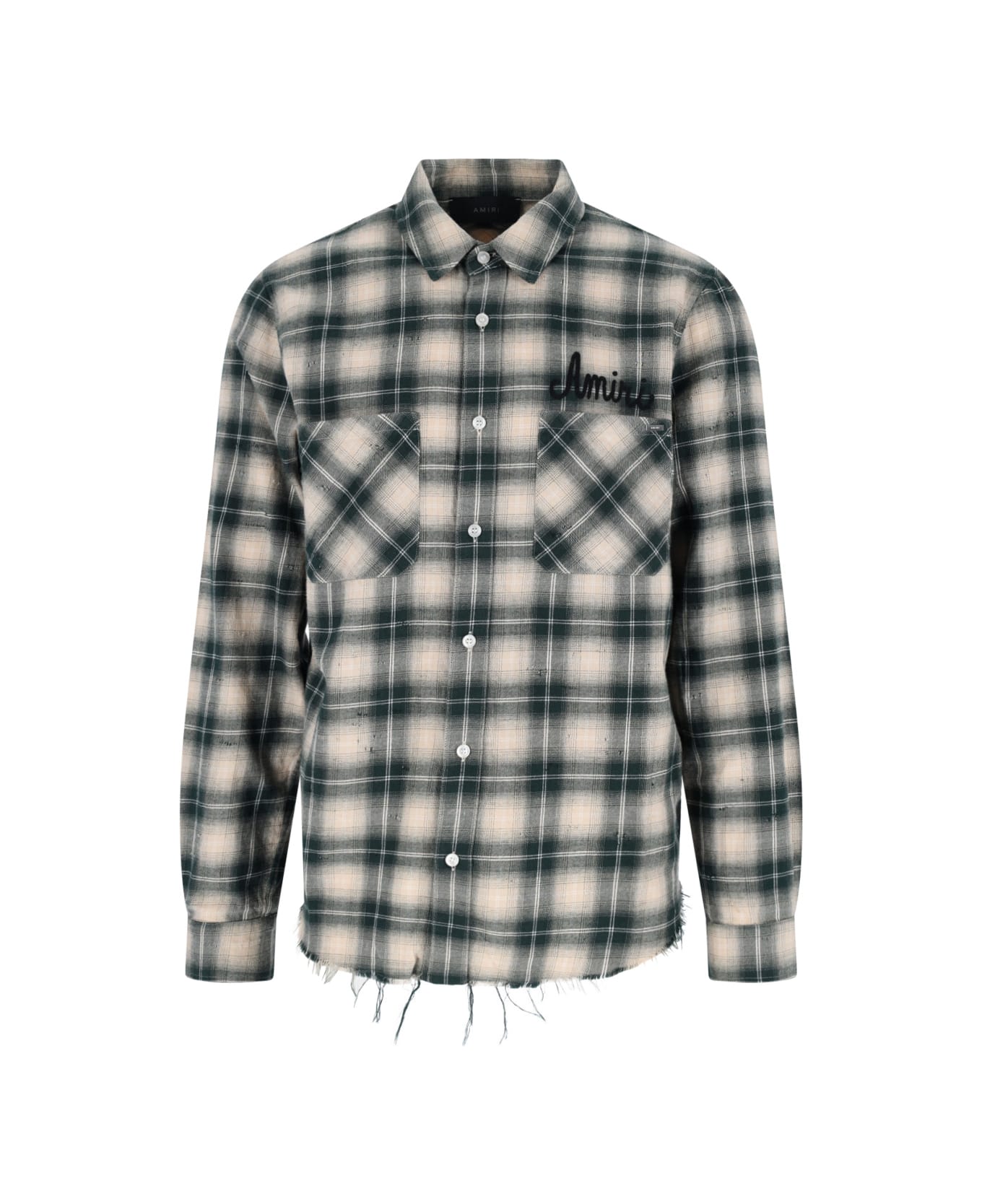 Amiri 'Shotgun' check shirt in green cotton with check pattern, all-over destroyed details, Battleworn effect, classic collar, button closure, black logo embroidery on the chest, two flat chest patch pockets, silver metal tag detail with engraved logo, maxi black logo embroidery on the back, button cuffs, raw cut hem.