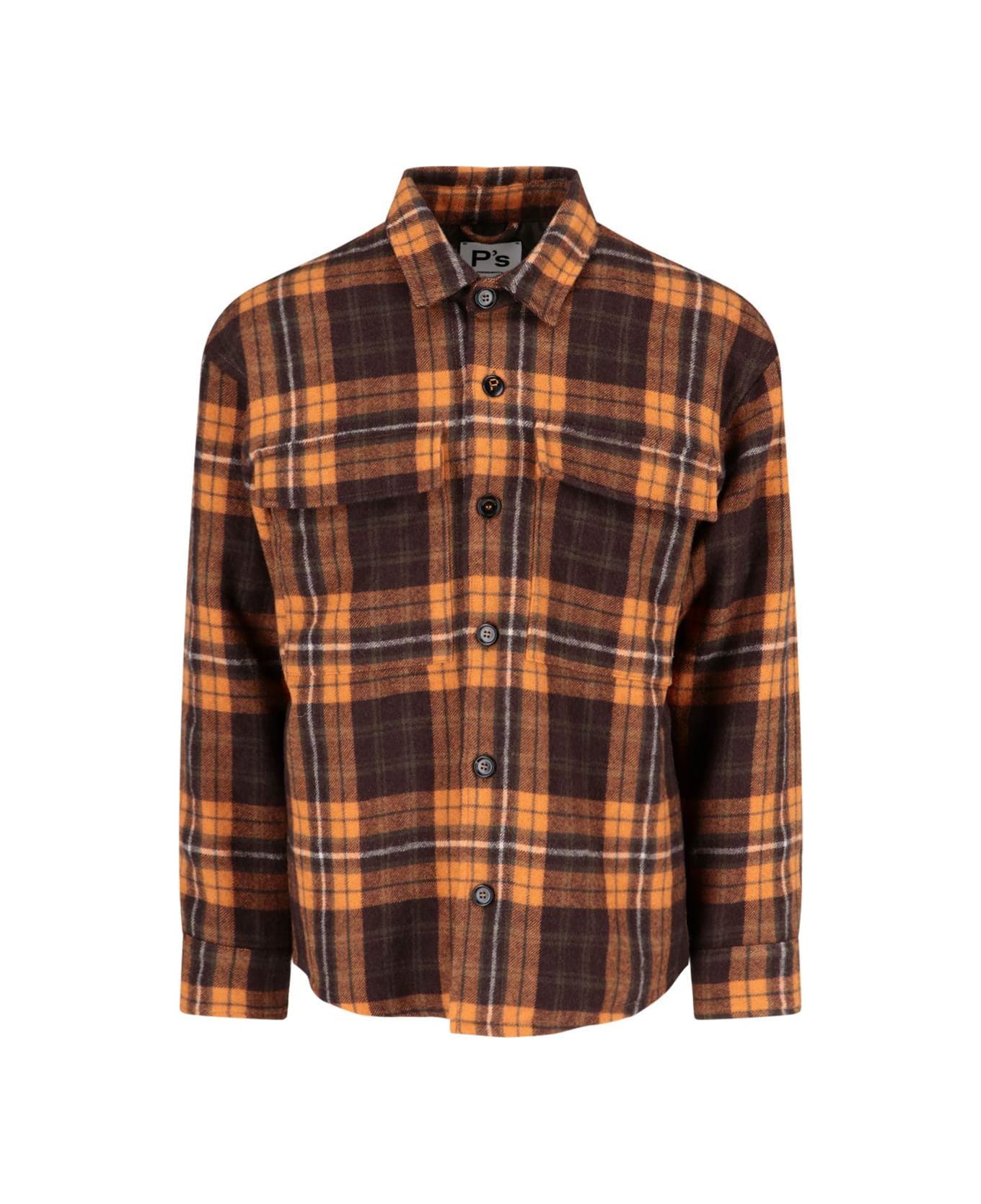 President's Check Shirt, made of wool, orange color, classic collar, front button closure, two front pockets, curved hem.