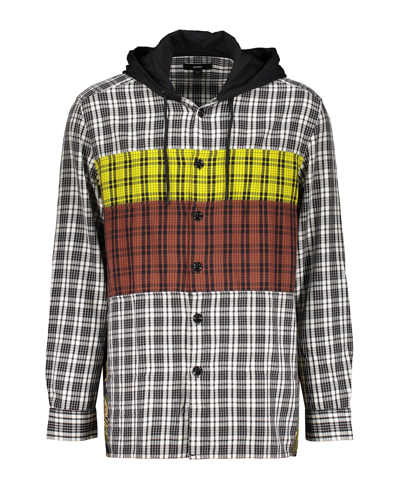 This shirt features a modern design with a plaid pattern in different shades. the upper part is characterized by horizontal stripes in bright colors, such as yellow and brown, creating an eye-catching contrast. the hood provides comfort and practicality, while the front closure and side pockets add functionality. made from soft materials, it's ideal for a casual and versatile look. perfect for pairing with jeans and sneakers for an informal outfit.