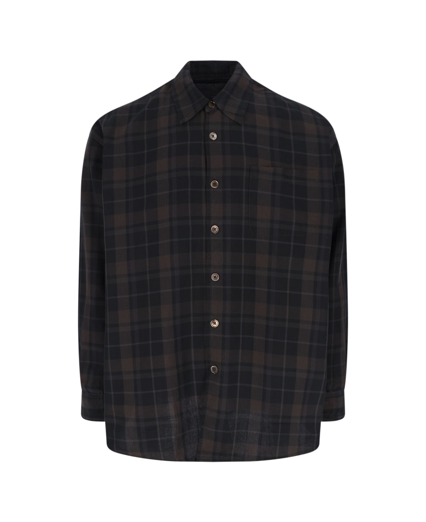Our Legacy check shirt in black cotton blend with check pattern, classic collar, button closure, chest pocket, button cuffs, curved hem. Composition: 55% Polyester, 45% Cotton