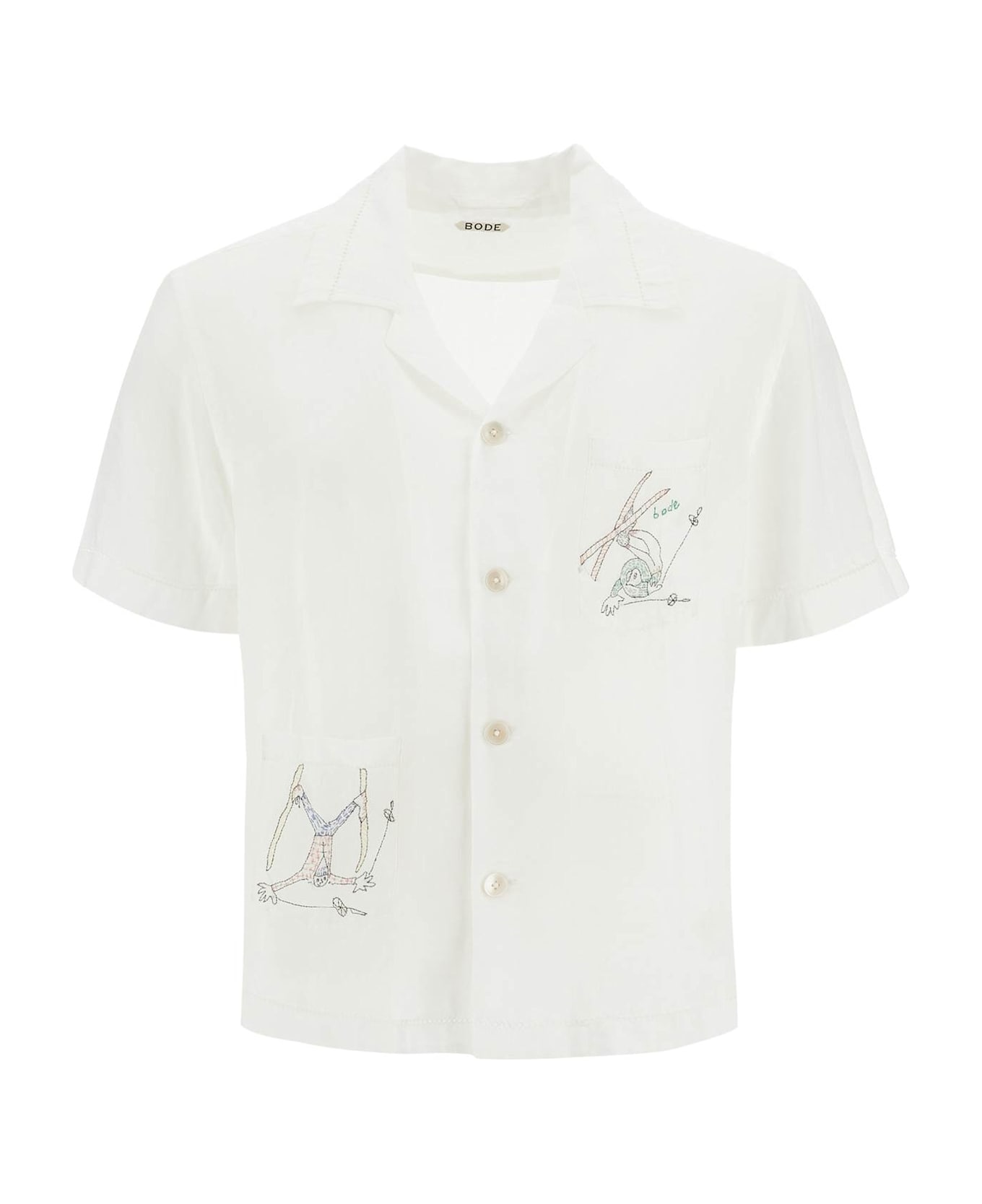 The Bode shirt is made of linen and features a boxy design with a Cuban collar. It is adorned with picot details and skier motifs embroidered in single thread. The model is 182 cm tall and wears a size M.