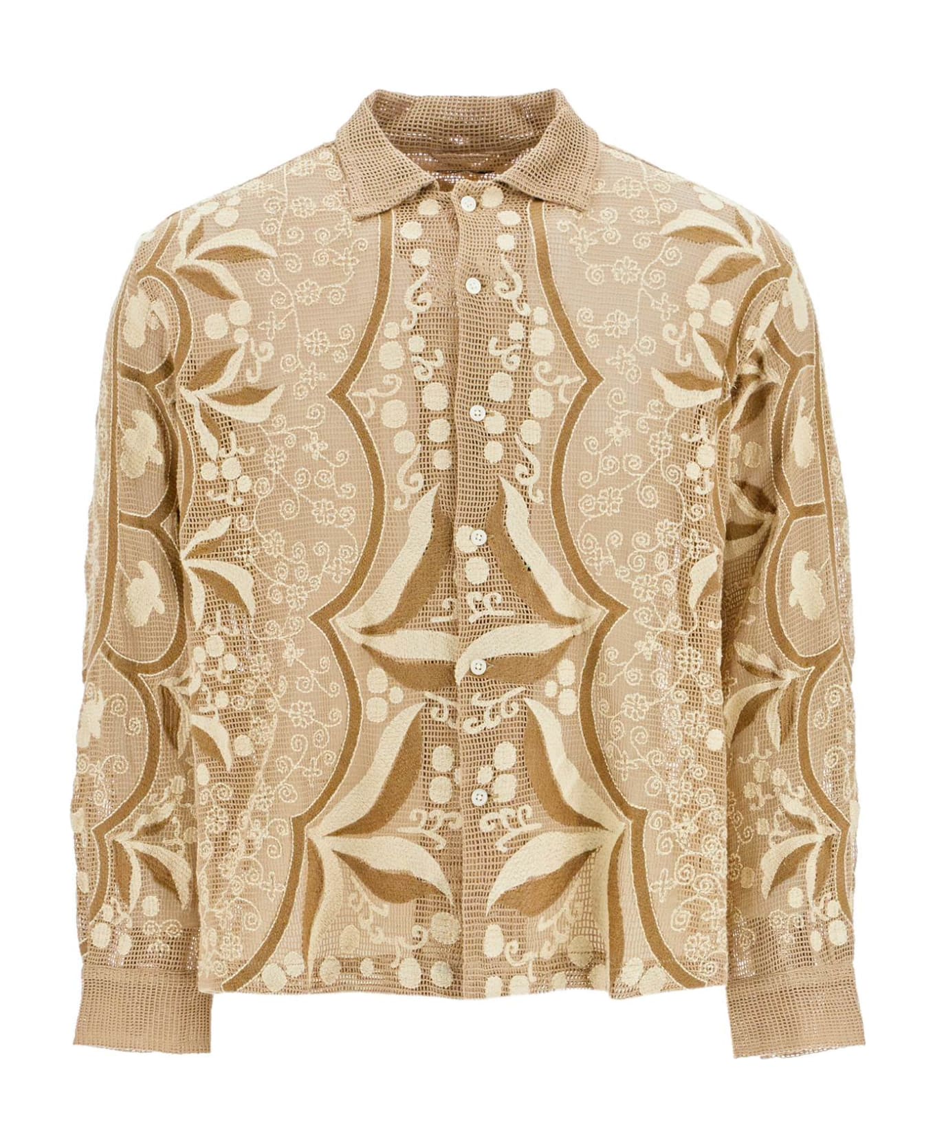 Bode button-up shirt crafted of embroidered filet lace inspired to vintage home decor textiles. Cut to a boxy fit, it is finished with a classic collar and buttoned cuffs. The model is 187 cm tall and wears a size M/L.