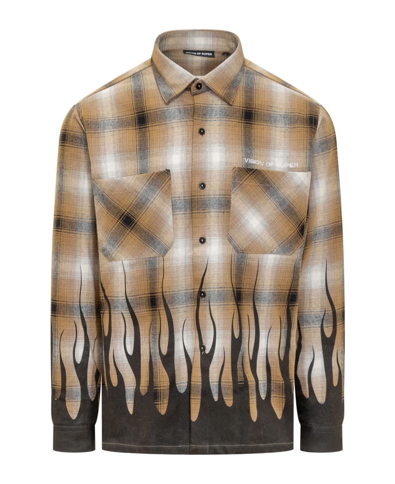 Long sleeve shirt. Front button closure. Chest pockets. Embroidered logo on the chest. Flame print on the bottom. Tartan pattern. Buttons on the wrists.
