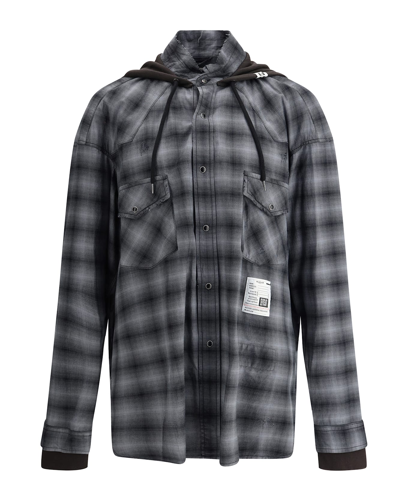 Cotton shirt by maison mihara yasuhiro with a strong character and vintage style. model with a drawstring-adjustable hood and front snap-button closure. it features two welt flap patch pockets on the front and elastic ribbed cuffs for added comfort. the worn-effect design with check pattern and iconic monogram patch appliqué on the front lends an authentic, gritty aesthetic. the oversized fit completes the look with a contemporary streetwear touch.