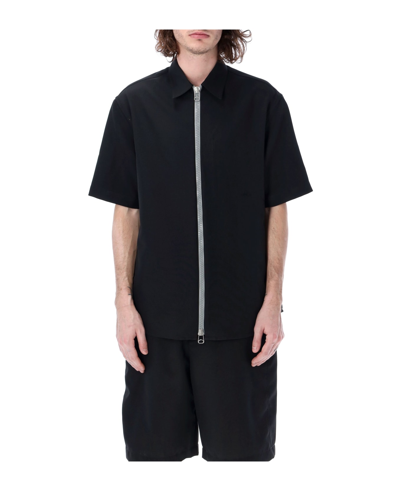 Ian Short Sleeves Shirt By Oamc. Featuring: Loose Fit Point Collar Full Zip Fastening Internal Pocket At Chest Short Sleeves Embroidered Logo Curved Hem Model Is 1,90 M Tall And He Is Wearing Size L
