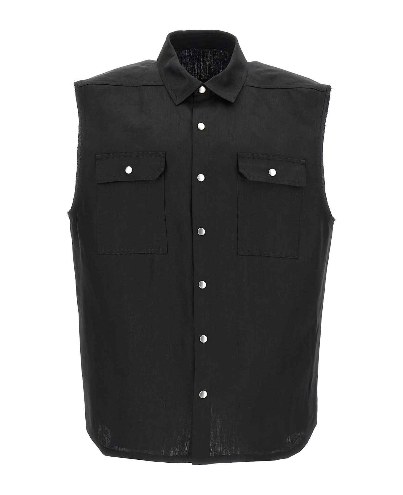 'Jumbo SL Outershirt' linen twill shirt with semi-glossy medium weight, front snap button closure, pockets, sleeveless, cotton strap with rivets on the back rack.