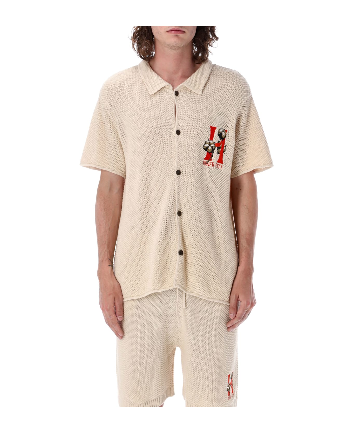 Cotton Knit H Button Up By Honor The Gift. Featuring: Spread Collar Front Button Fastening Short Sleeves Art Embroidery At Left Chest Straight Hem Model Is 1,90 M Tall And He Is Wearing Size L
