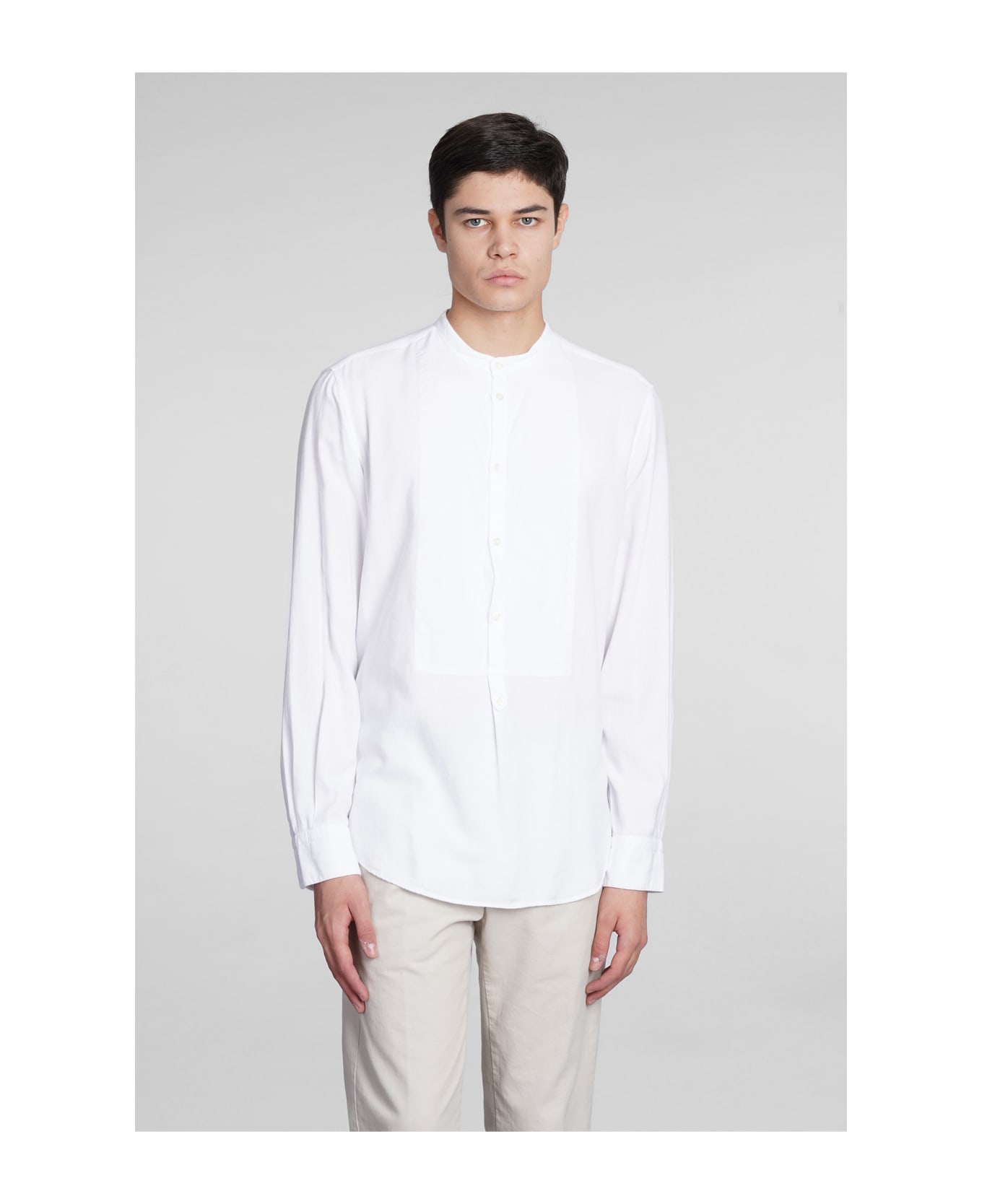 Kos Shirt in white viscose, mao collar, long sleeves, curved hem, frontal buttoning, 60% viscose, 40% Cotton, Made in Italy, Model is 1. 83 and wears size M