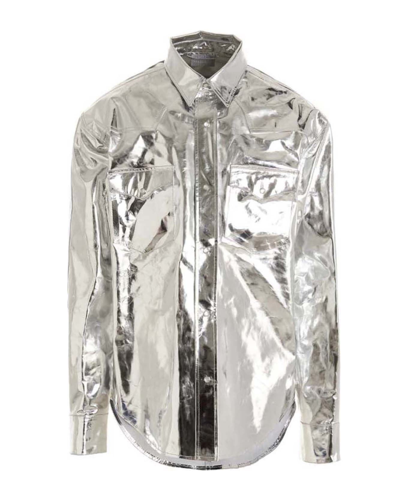 Laminated leather overshirt with very rigid style with button closure and patch pockets.