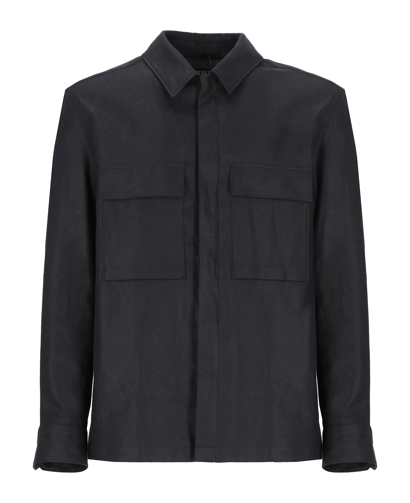 - Dark blue Zegna linen shirt for man - Collar - Long sleeves - Two front flap pockets with buttons - Front buttons fastening Composition: 100% Linen