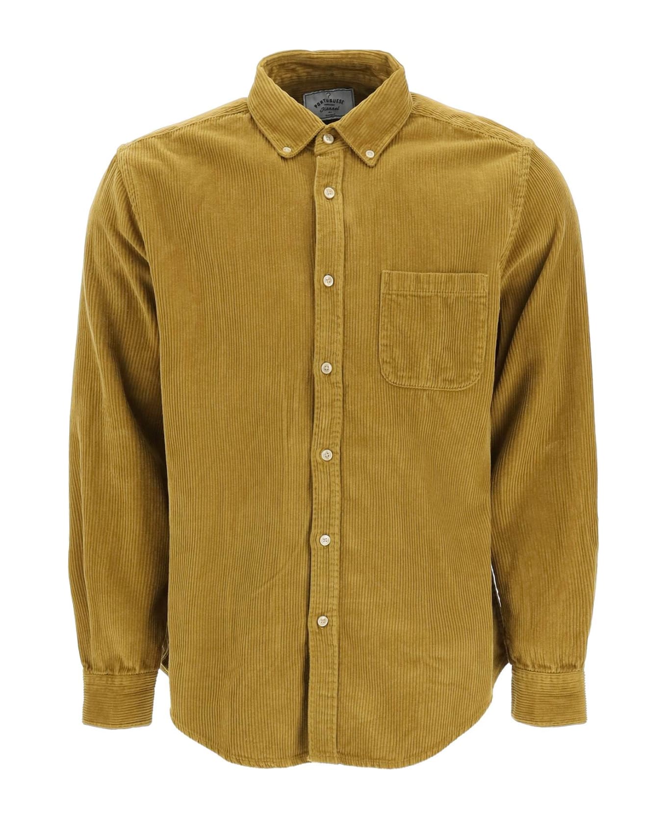 Portuguese Flannel regular-fit shirt made of cotton corduroy. It features pointed button-down collar, front button placket, a chest patch pocket and rounded adjustable cuffs. The model is 187 cm tall and wears a size L.