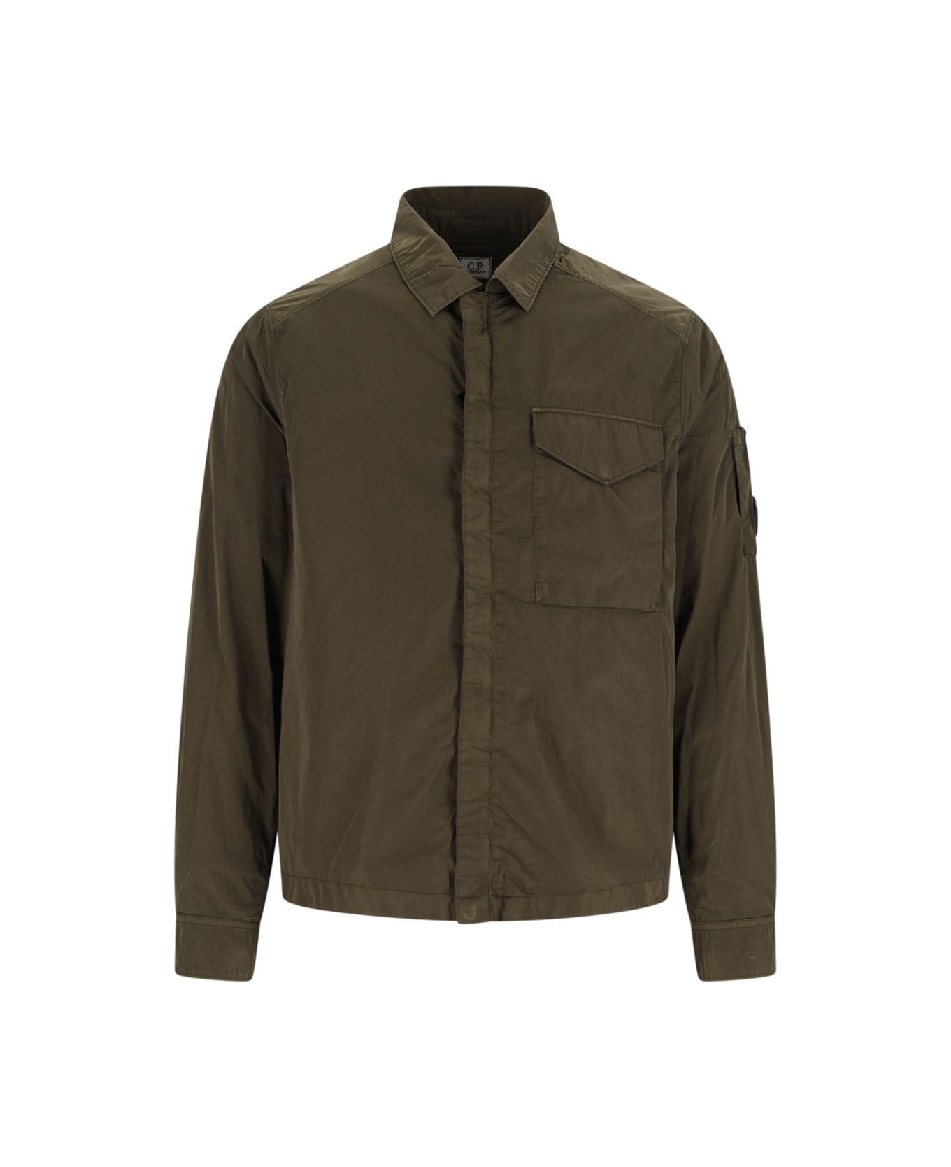 C. P. Company logo shirt jacket in green fabric with classic collar, zip closure, flap pocket on the chest, flap pocket with button closure on the sleeve, contrasting logo hardware detail on the sleeve, straight hem.