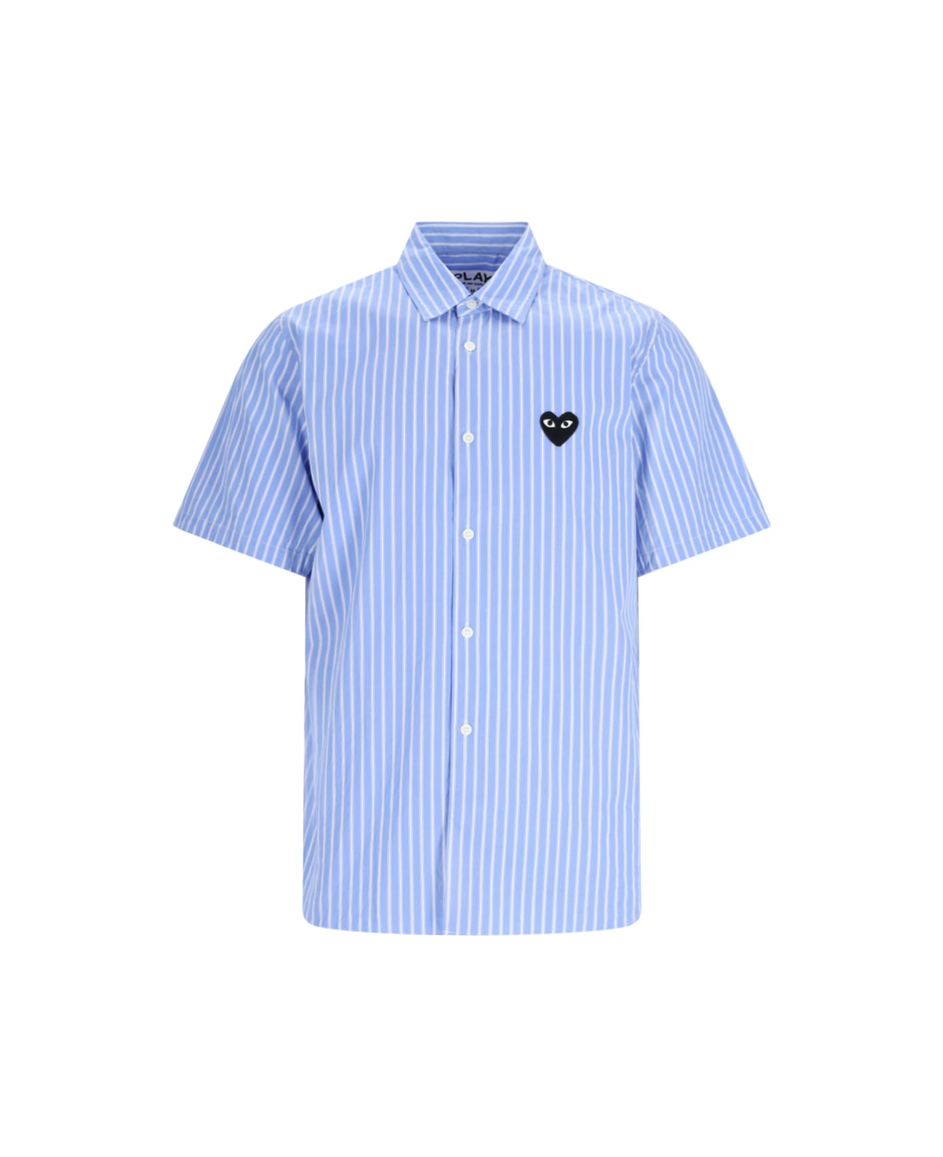 Comme des Garcons Play logo shirt in light blue cotton with white striped pattern, classic collar, button closure, short sleeves, logo embroidery on the chest, and straight hem.